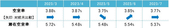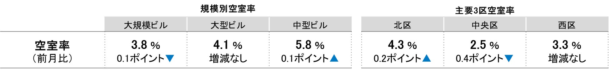 空室率は前月比マイナス0.08ポイントの3.77%となり、前月から小幅に低下した。拡張移転や立地改善を目的とした移転により成約した。空室率は3%台後半で小幅な動きが続いている。潜在空室率は前月比マイナス0.17ポイントの5.37%だった。オフィス需要は引き続き小口の面積帯が中心であるが、大口の面積帯も増加傾向にあり、テナントの移転に向けた動きは活発な状況となっている。