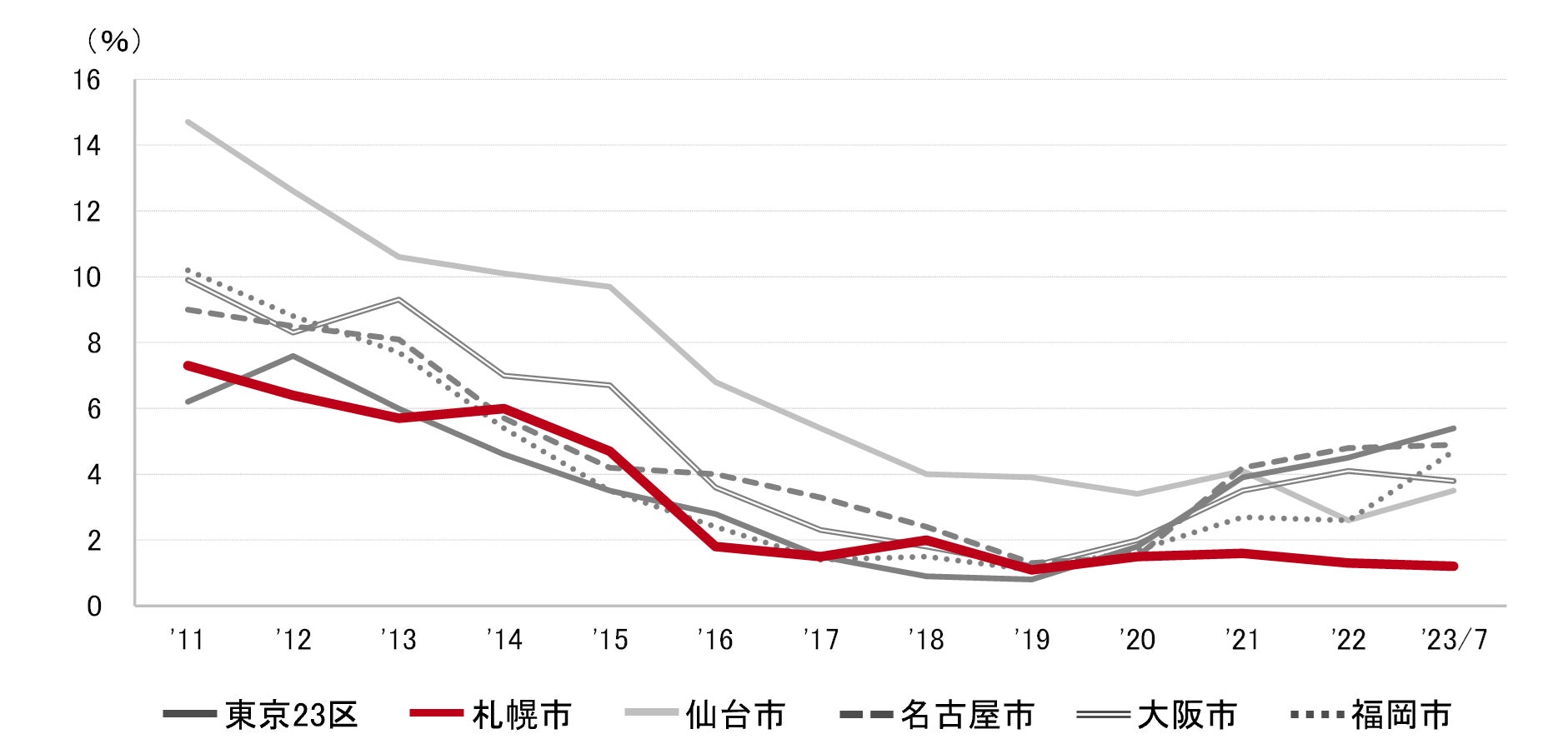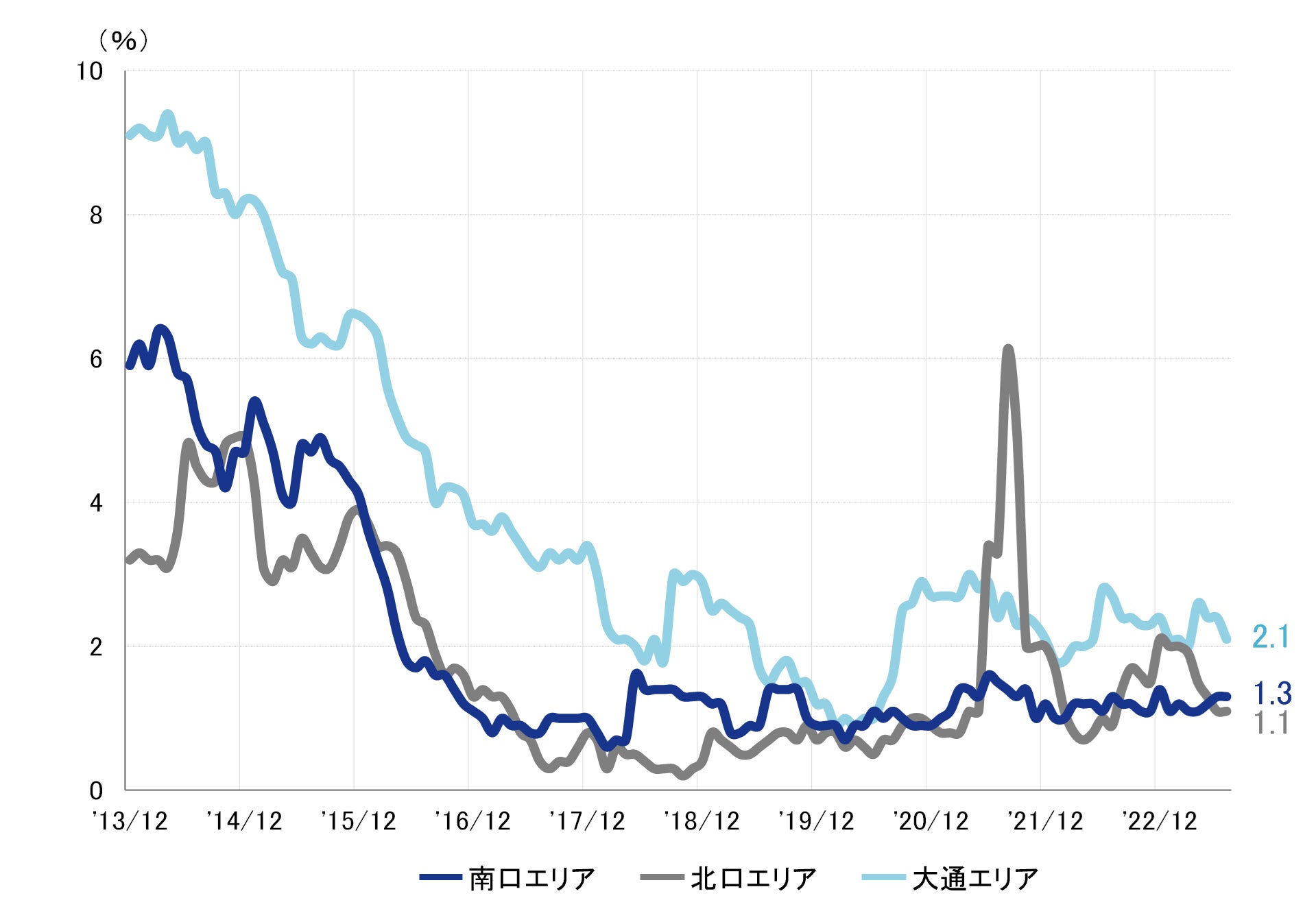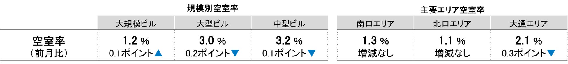 全規模ビル 主要エリア 空室率:「大通」低下し、1%台が目前に