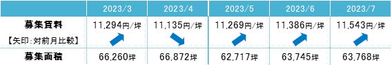 募集賃料は前月比プラス157円/坪の11,543円/坪となった。3ヵ月連続で上昇し、統計開始以来の最高値更新が続いている。