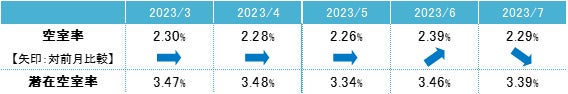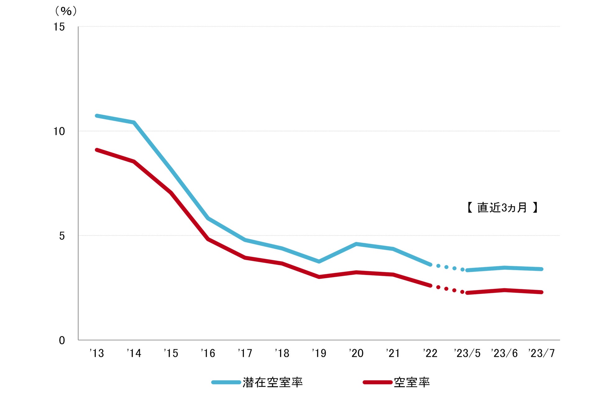 空室率は前月比マイナス0.10ポイントの2.29%となり、19ヵ月連続で2%台の低水準となっている。周辺エリアから主要エリアへの立地改善を目的とした移転や、拡張移転等により成約し、主な低下要因となっている。潜在空室率は前月比マイナス0.07ポイントの3.39%だった。テナントの移転に向けた動きは活発な状況にあり、拡張や新規開設等の前向きな需要の割合が高い。