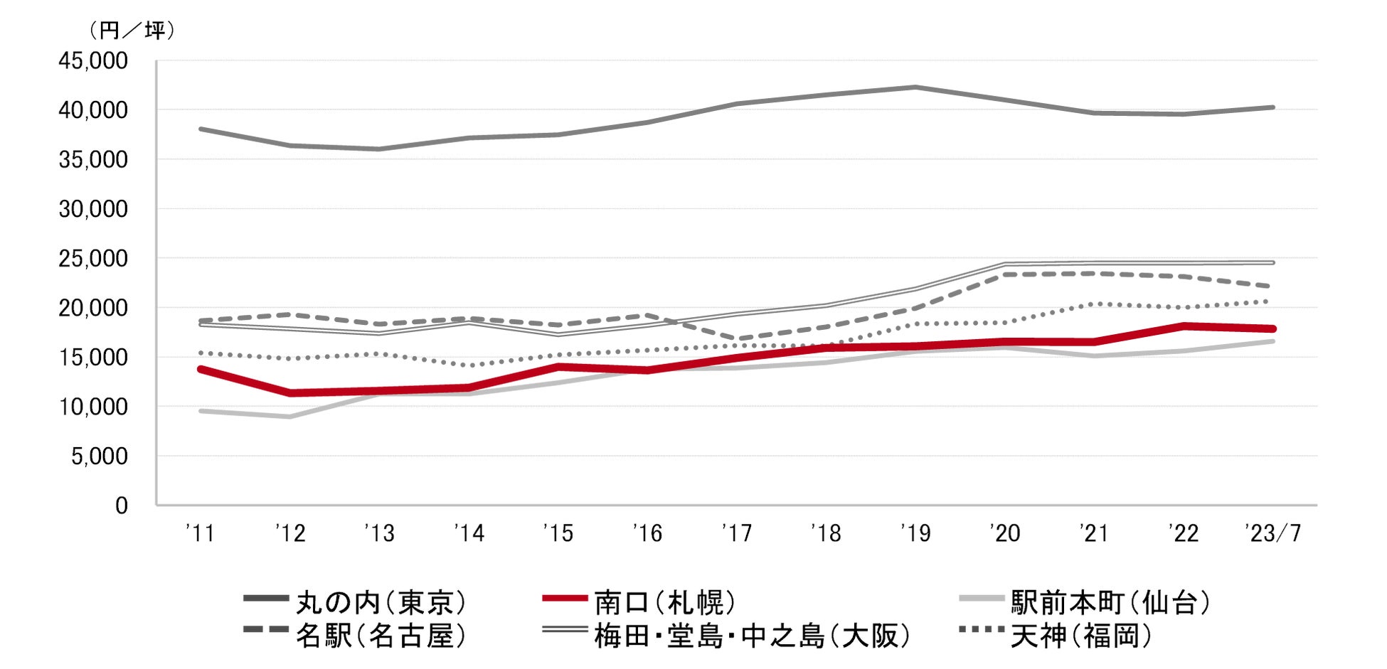 <募集賃料の推移(6大都市 大規模ビル・主要駅前地区)>