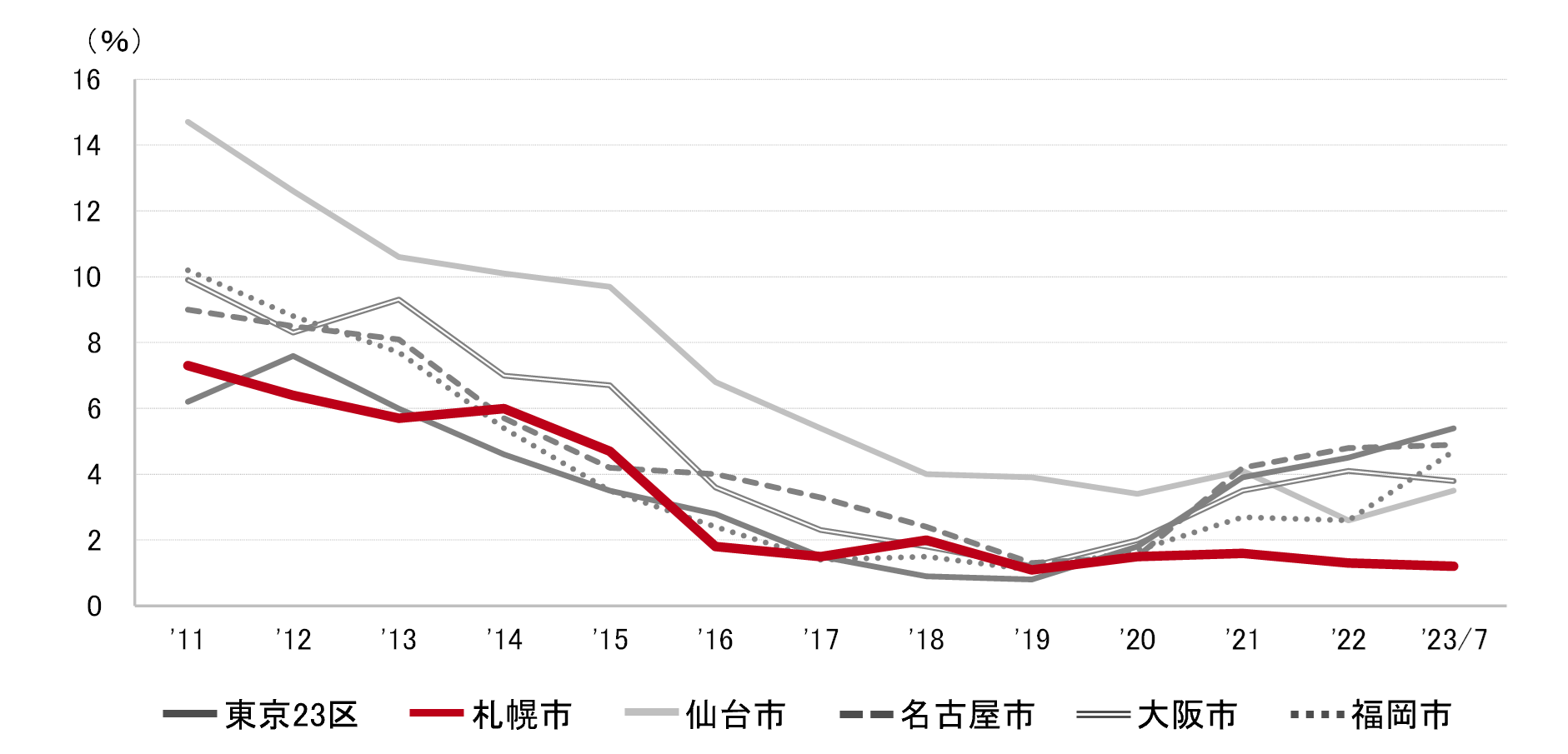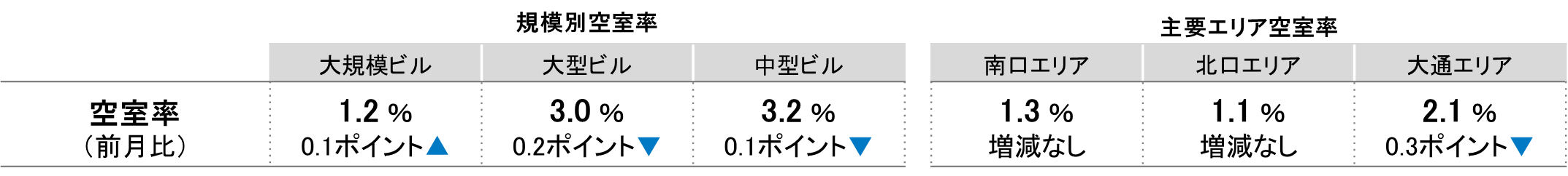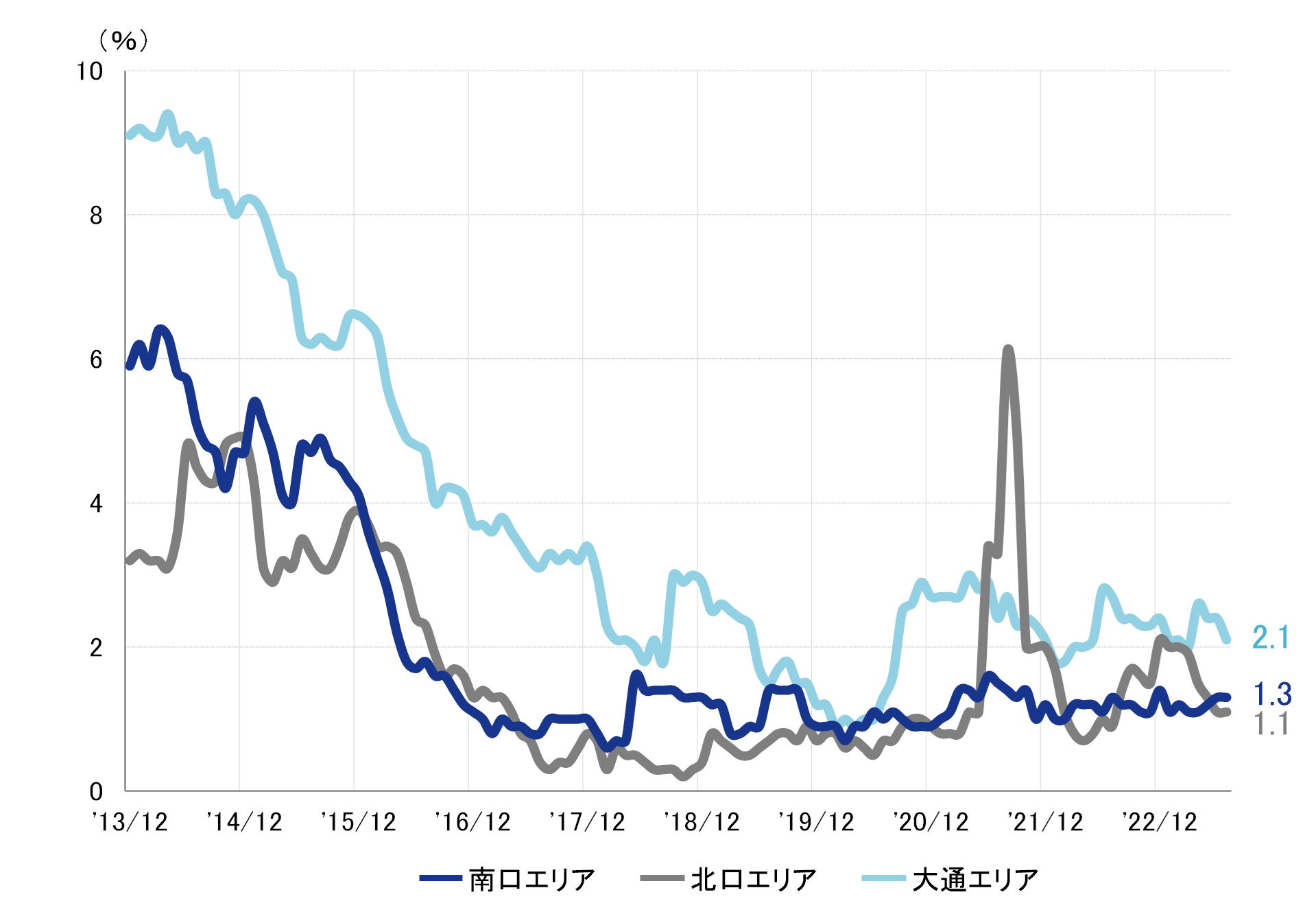 全規模ビル 主要エリア 空室率:「大通」低下し、1%台が目前に