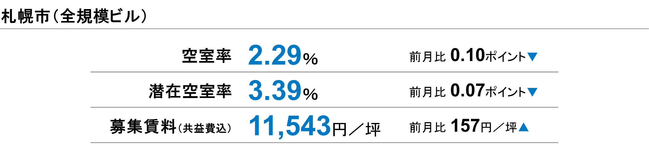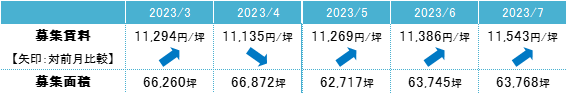募集賃料は前月比プラス157円/坪の11,543円/坪となった。3ヵ月連続で上昇し、統計開始以来の最高値更新が続いている。