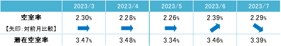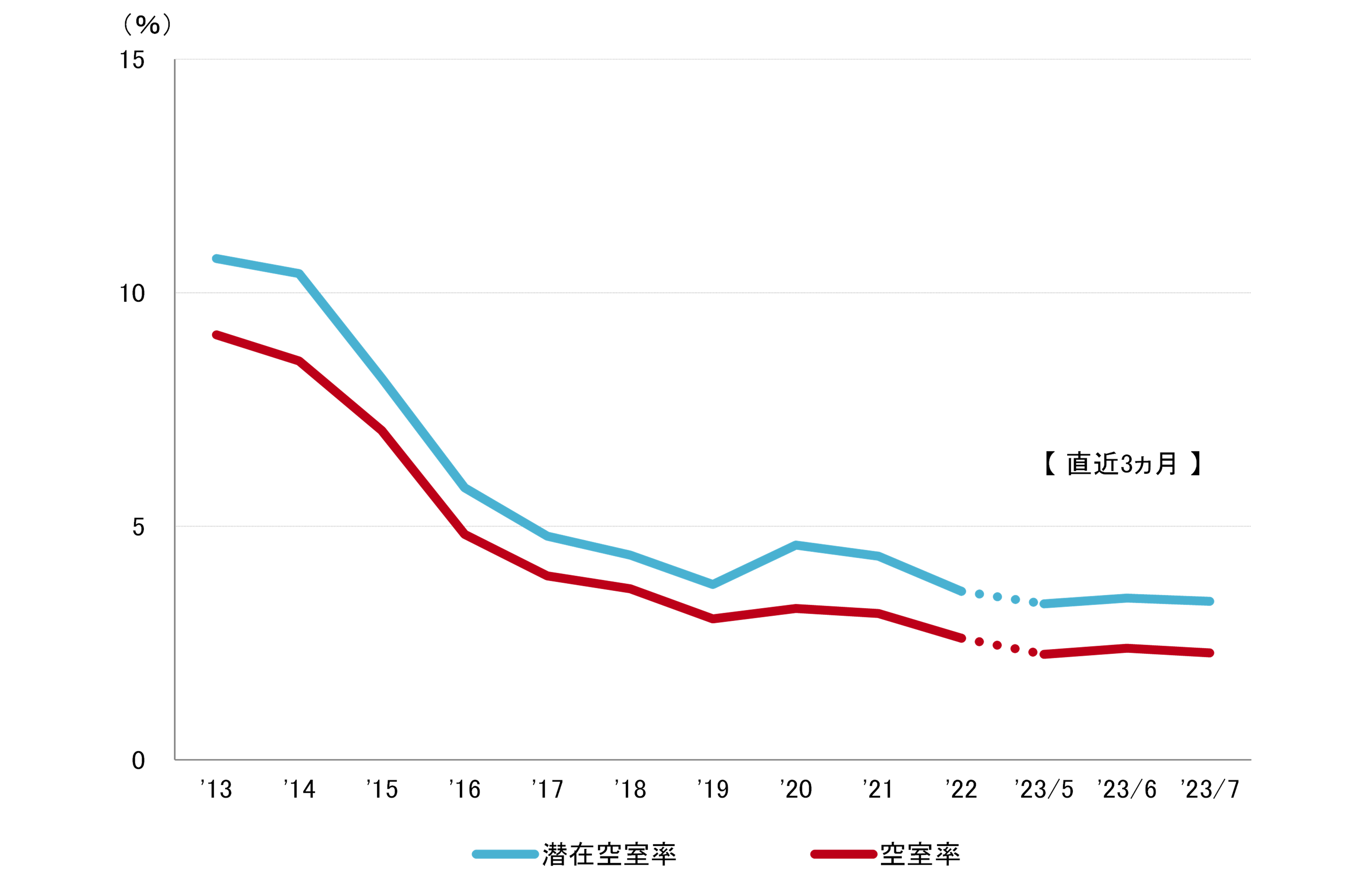 空室率は前月比マイナス0.10ポイントの2.29%となり、19ヵ月連続で2%台の低水準となっている。周辺エリアから主要エリアへの立地改善を目的とした移転や、拡張移転等により成約し、主な低下要因となっている。潜在空室率は前月比マイナス0.07ポイントの3.39%だった。テナントの移転に向けた動きは活発な状況にあり、拡張や新規開設等の前向きな需要の割合が高い。