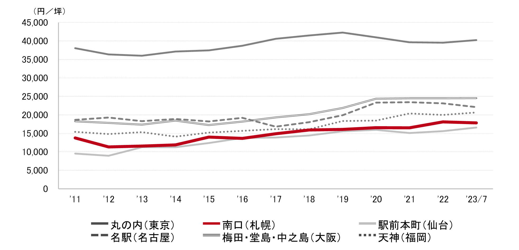 <募集賃料の推移(6大都市 大規模ビル・主要駅前地区)>