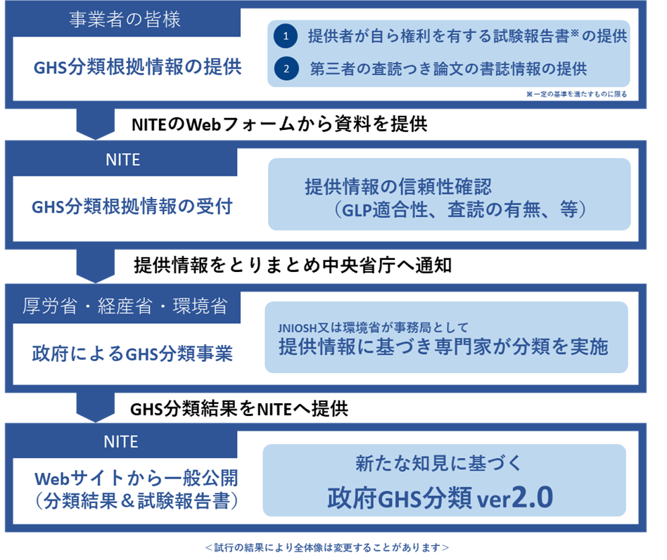 NITEは、化審法における新規化学物質の情報受付等の豊富な経験を有することから、この受付窓口を担うことになりました。民間企業から提出された試験情報はNITEで確認を行った後に、厚生労働省、経済産業省、環境省やJNIOSHと共有され、政府によるGHS分類事業で使用されます。使用された試験情報については最終的にGHS分類結果とともにNITEのウェブサイトから公表される予定です。