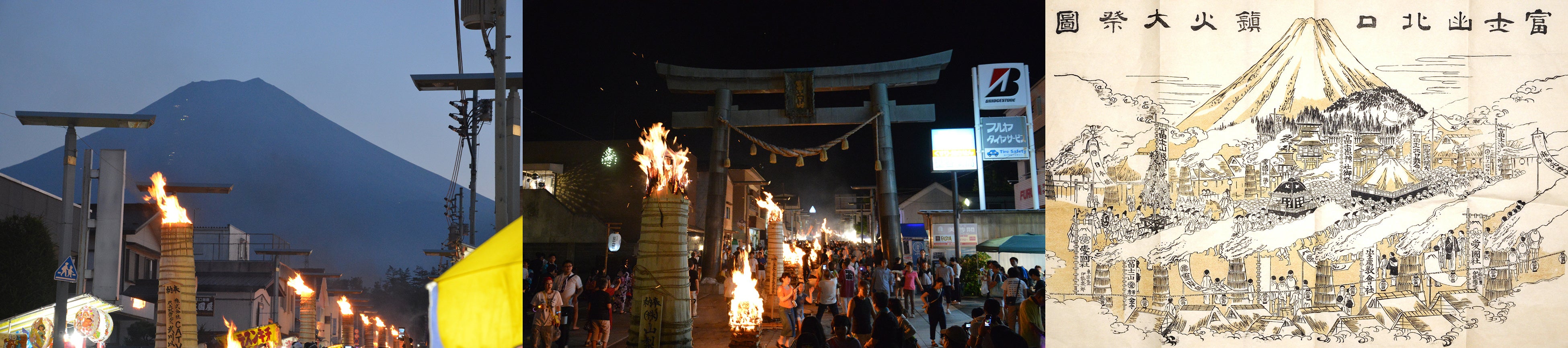 400年の歴史を持ち、国の重要無形民俗文化財にも指定される日本三奇祭の1つ「鎮火大祭」通称「吉田の火祭り」は、富士山の山じまいの祭りとして、富士山の麓である富士吉田市の北口本宮冨士浅間神社と諏訪神社にて開催される歴史あるお祭りです。明神型神輿と富士山型神輿のデザインや形の異なる二基の神輿が町を練り歩き、そして祭りの名のごとく、高さ3メートルの筍形に結い上げられた大松明100余本、家毎に井桁に積まれた松明に一斉に火が灯され、富士吉田の夜空を炎が彩る神秘的な祭り行事となっております。また今回の観覧に際し、富士吉田市学芸員によるガイドのご案内に加え、塩加持と呼ばれるお焚き上げの神事の体験を実施いたします。