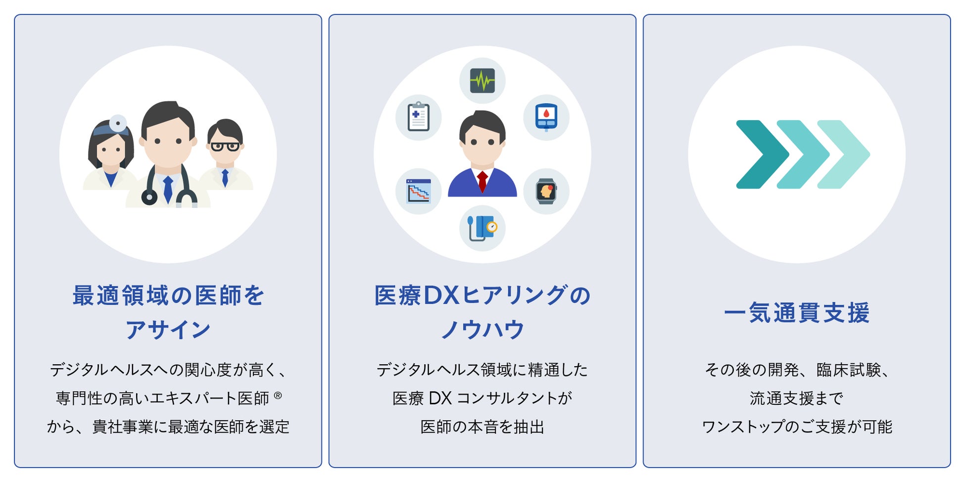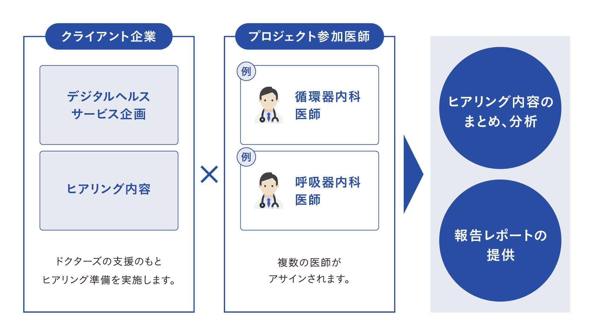 ドクターズは、これまで多くの企業の医療DX/デジタルヘルス事業開発のご支援を実施しており、医療現場の生の声を事業企画の初期段階から丁寧に聞き込み、事業企画案や事業仮説を検証し、事業の成功確率を高めてまいりました。「Doctors  Cloud® Insights」では、ドクターズが蓄積してきた豊富な医師ヒアリング経験を活かし、企業さまの事業仮説や需要のお受け取りから適切な医師の選定、医師へのヒアリング実施、報告レポート作成までをスピーディに実施することで、企業さまの迅速な意思決定や医療・ヘルスケア事業検討の土台として活用いただくことを可能にしました。