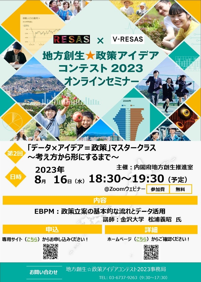 内閣府地方創生推進室では、「地方創生☆政策アイデアコンテスト2023」に向け、オンライン(Zoomウェビナー)にて、RESAS×V-RESAS 地方創生☆政策アイデアコンテスト2023 オンラインセミナー 第2回 「「データ×アイデア=政策」マスタークラス~考え方から形にするまで~」を開催いたします。