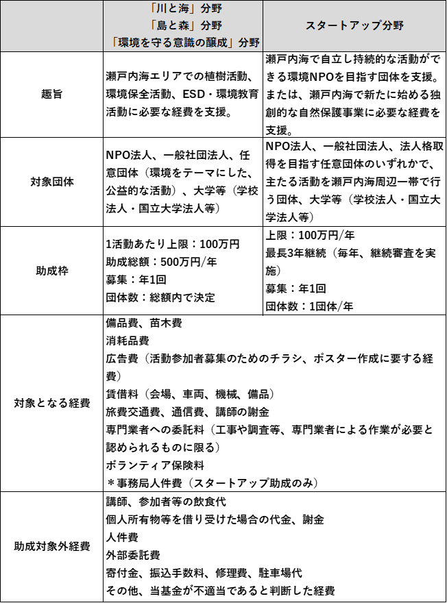 NPO法人、一般社団法人、法人格取得を目指す任意団体のいずれかで、主たる活動を瀬戸内海周辺一帯で行う団体、大学等(学校法人・国立大学法人等)