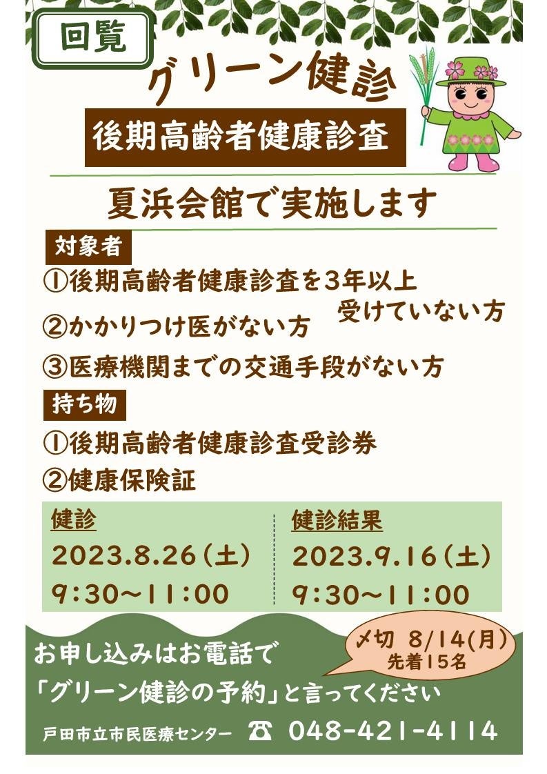 戸田市立市民医療センターの医師や看護師等が町会会館に出向き、後期高齢者健診を実施します。