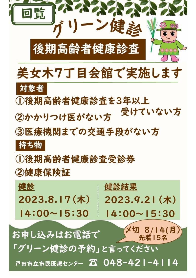 戸田市立市民医療センターの医師や看護師等が町会会館に出向き、後期高齢者健診を実施します。