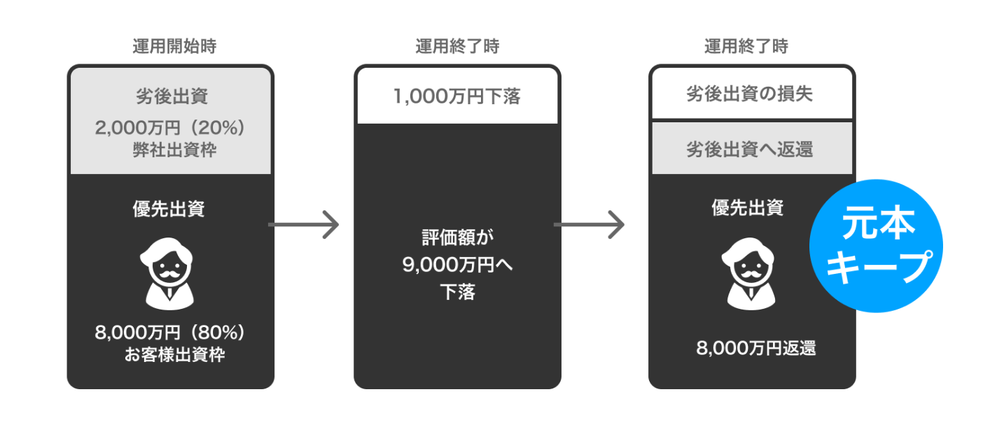 お客様からの出資を「優先出資」、事業者からの出資を「劣後出資」として、お客様が優先して出資金の返還を受ける仕組みとなっております。