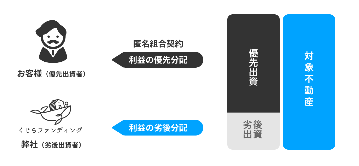 くじらファンディングでは、お客様の出資元本の安全性を高めるため、優先劣後システムを採用しております。