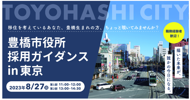 愛知県豊橋市へ移住して市役所に転職しませんか。豊橋市役所はこの夏、民間企業から転職した市職員による「職務経験者」向け採用ガイダンスを初めて東京で開催します。さらに、9月には職務経験者試験の2次試験を東京でも実施予定です。豊橋の未来のため、民間企業で培ってきた知識と技術を、ぜひ貸してください!