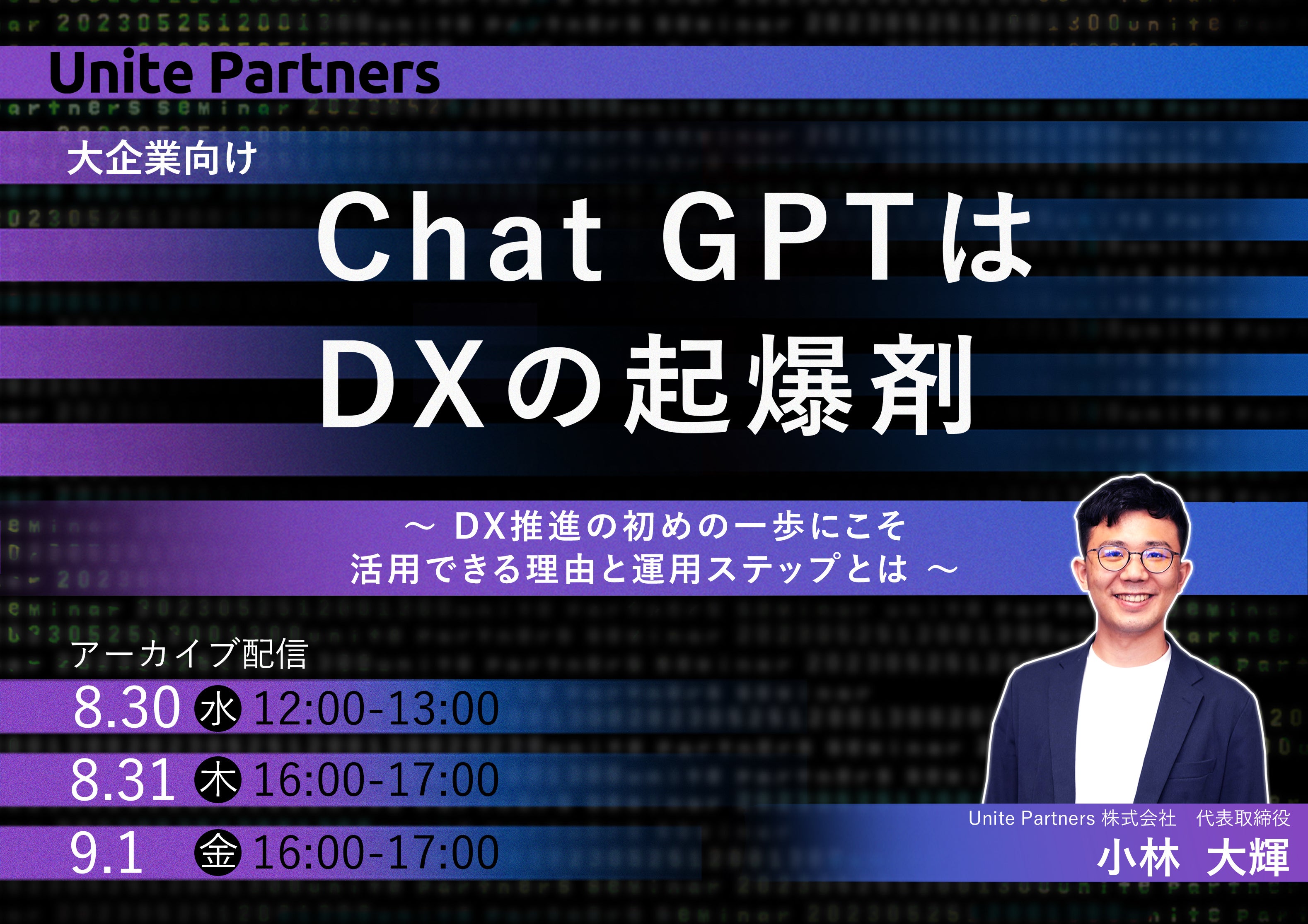企業の変革パートナーを目指すブティック型コンサルティングファームのUnite Partners株式会社(本社:東京都、代表取締役:小林大輝)は、2023年8月30,31日、9月1日に、「ChatGPTはDXの起爆剤〜 DX推進の初めの一歩にこそ活用できる理由と運用ステップとは 〜」と題して大企業のDX担当者向けのセミナーを開催します。