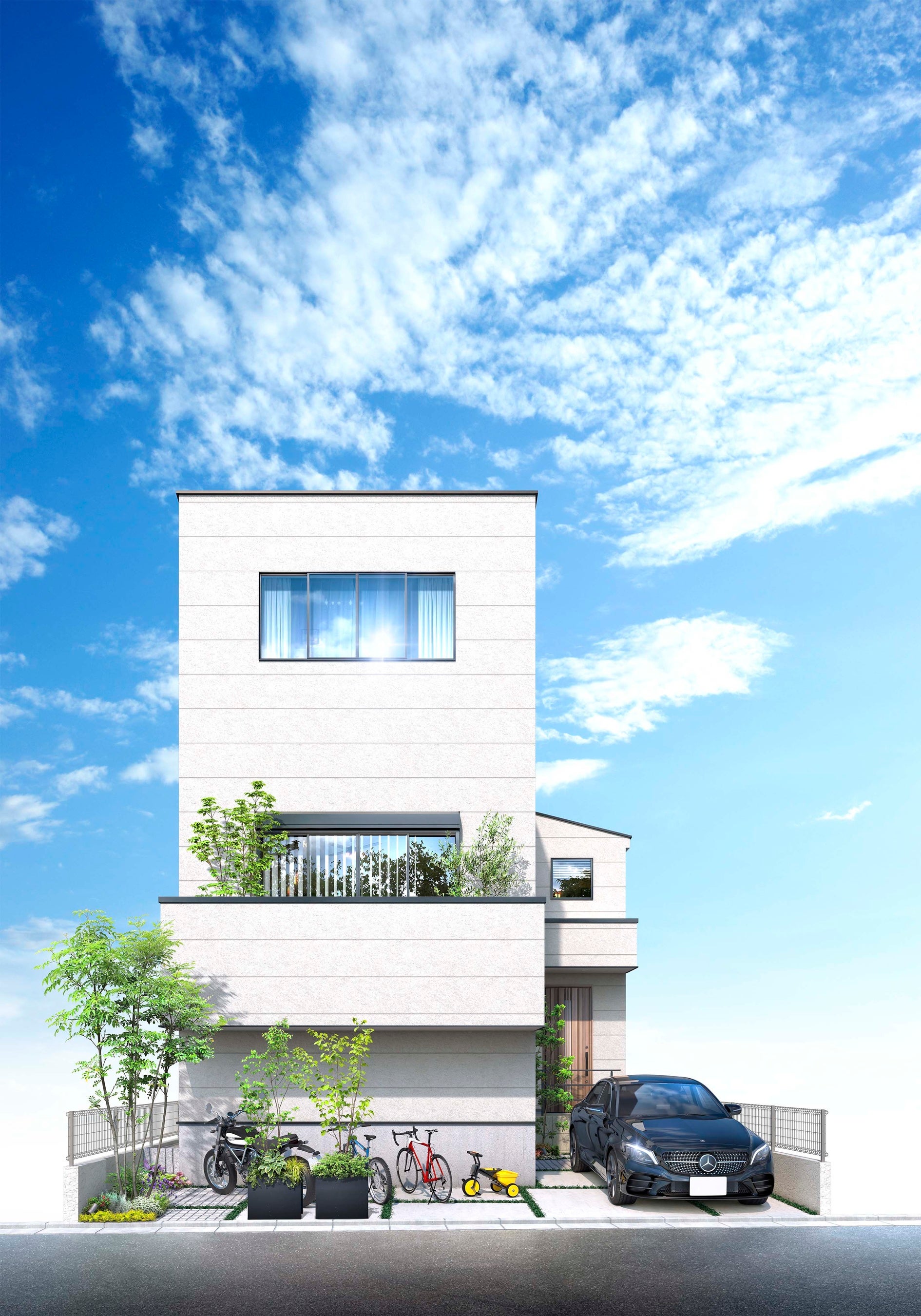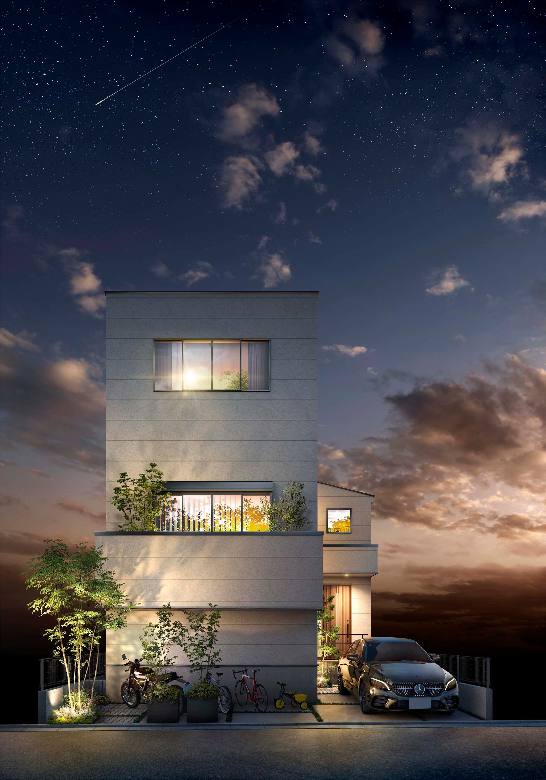 家の印象を決めるファサードは、白を基調としたスッキリした雰囲気に仕上げました。広い窓に映った空の青さもデザインの一部で、直線のラインを強調するシャープなデザインが、おしゃれな街並みに馴染みます。雨で汚れが落ちるスタイリッシュなサイディングで、建物の外観を長く美しく保てることもポイントです。夜はLED照明が点灯し、昼の印象とは一転して暖かな光に包まれます。『灯かりのいえなみ協定』で暗くなると自動で灯りが点くため、防犯対策にもなります。