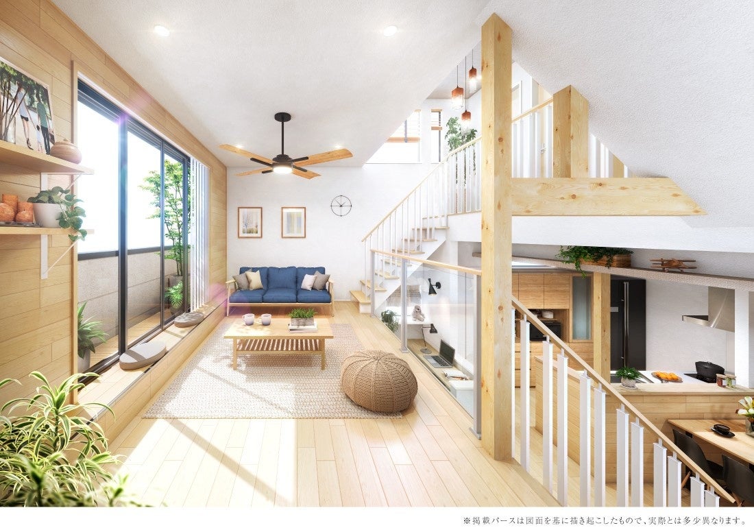 リビングに一歩足を踏み入れて感じるのは、空間の広さと明るさ。吹き抜けのある1.5階リビングが、かけがえのない家族との時間を叶えてくれます。そのリビングの下はピットキッズルーム(納戸)。子どもの遊び場から大人の趣味スペースまで、空間の余白としてアイデア次第で様々な使い方が可能です。2.5階にはロフトを設けて「個」のスペースもしっかりと確保。階層をずらすことで、どの階層にいても家族とのつながりが感じられるのが魅力です。また南東面にカースペース2台分を確保した開放的な区画で、明るい日差しが室内にたっぷりと降り注ぐよう設計しました。
