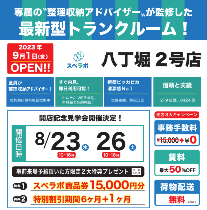オープンに合わせ8月23日(水)、8月26日(土)に見学会を実施しますので、ぜひ【スペラボ・八丁堀2号店】にお越しくださいませ。