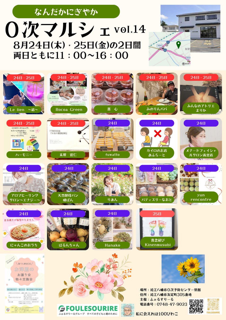 滋賀県近江八幡市0次予防センター別館で開催しています。健康には体力維持、現状回復に整体などが必要ですし、食においても健康に留意した食べ物を食べることが重要です。また、精神的な安定に欠かせないノウハウをしていただけるブースもたくさんご用意しています。夏休みももうすぐ終わりということもありますので子どもさんたちが楽しめるイベントもご用意しております。