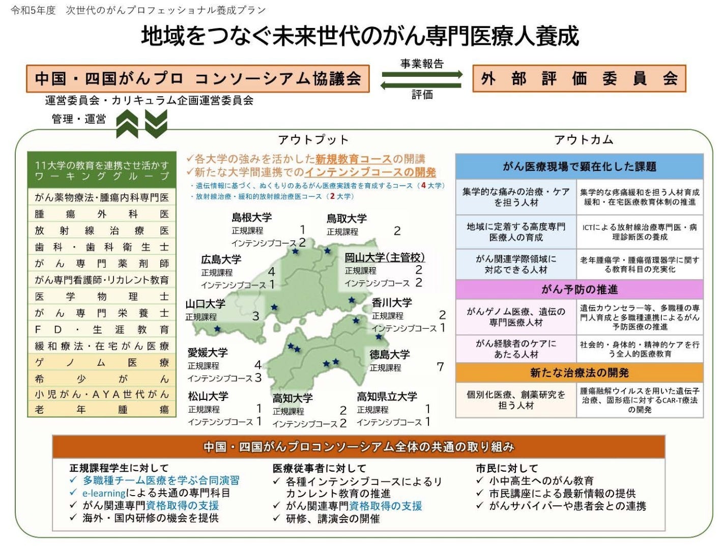 - 文部科学省が公募していた令和5年度「次世代のがんプロフェッショナル養成プラン」に、岡山大学を主幹校として中国・四国地方9県の11大学が連携した中国・四国広域がんプロ養成コンソーシアムのプロジェクト「地域をつなぐ未来世代のがん専門医療人養成」が採択されました。