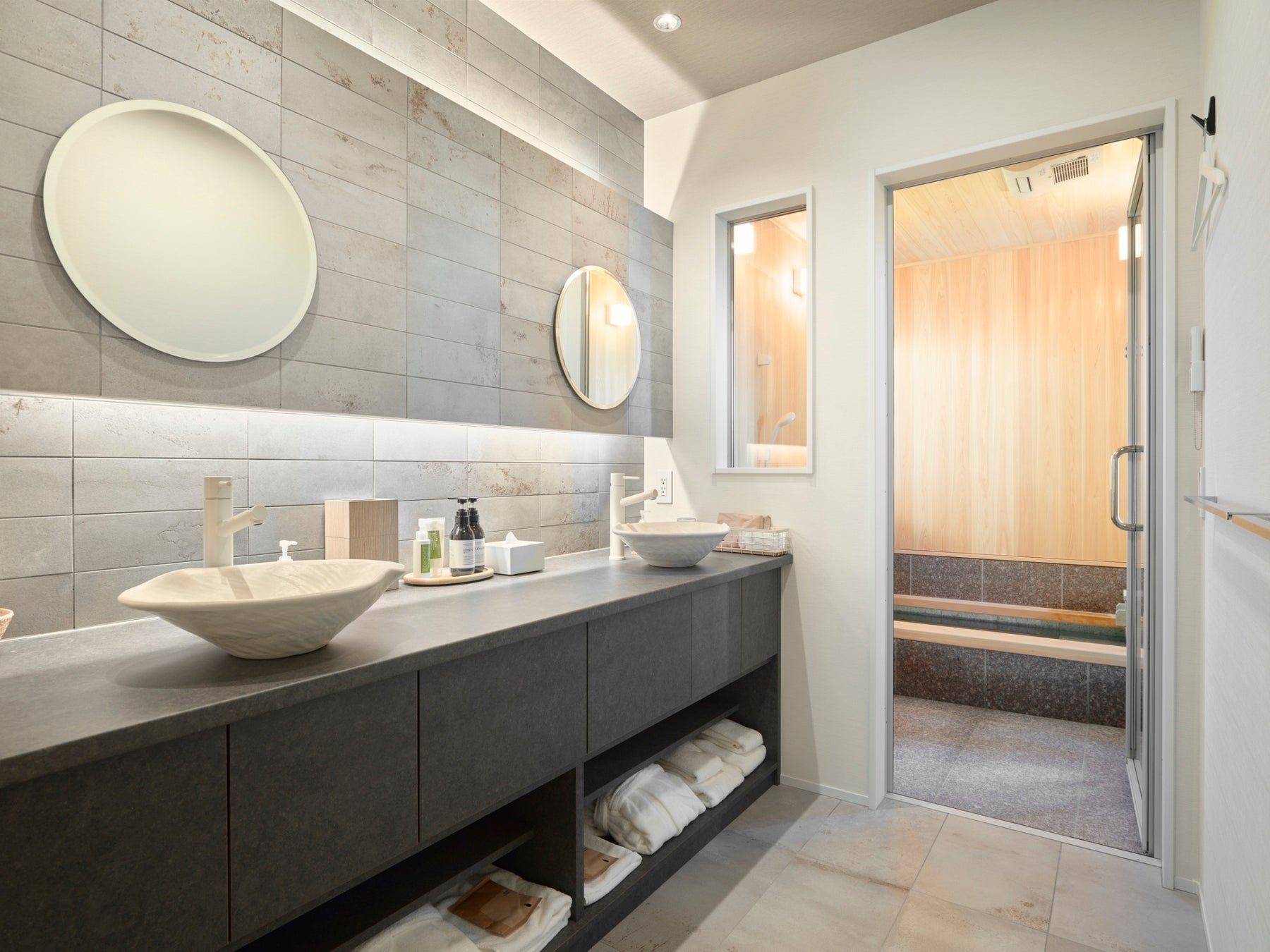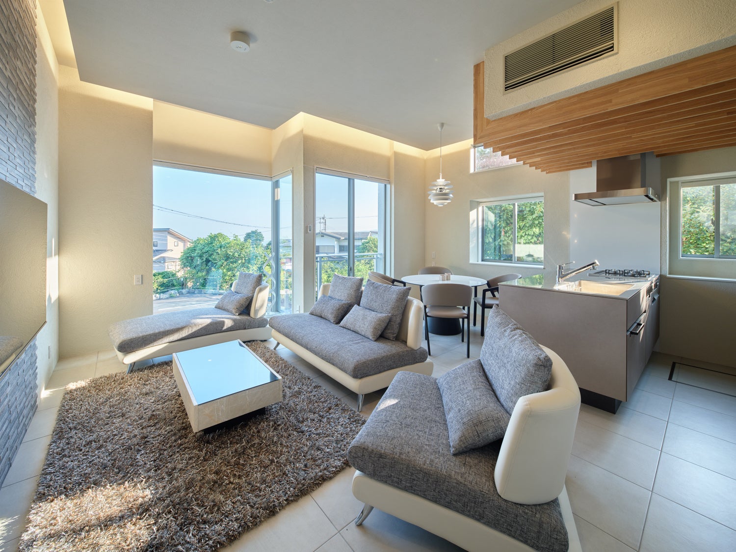 火山がもたらす自然の造形美や豊かな木々に囲われ、新しき建築の中にも良き趣きを感じる建物はリビングダイニングと寝室、客室温泉風呂で構成されたおおらかな空間。