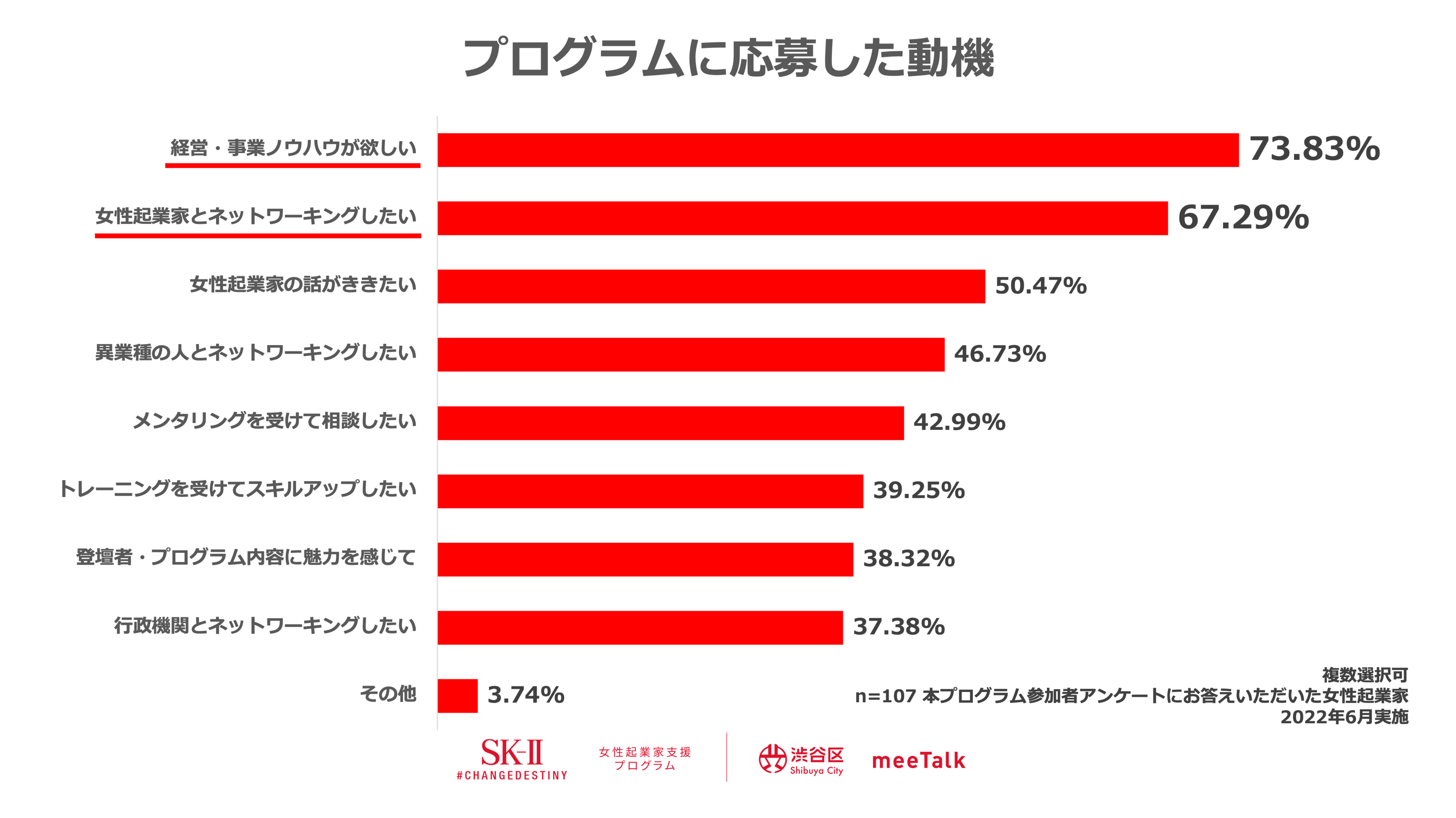 また、プログラム応募への動機としては「経営・事業ノウハウが欲しい」「女性起業家とのネットワーキングをしたい」といった回答が多く、実践的なノウハウや同じ起業仲間をコロナ禍で得ることが難しかったことが読み解けます。