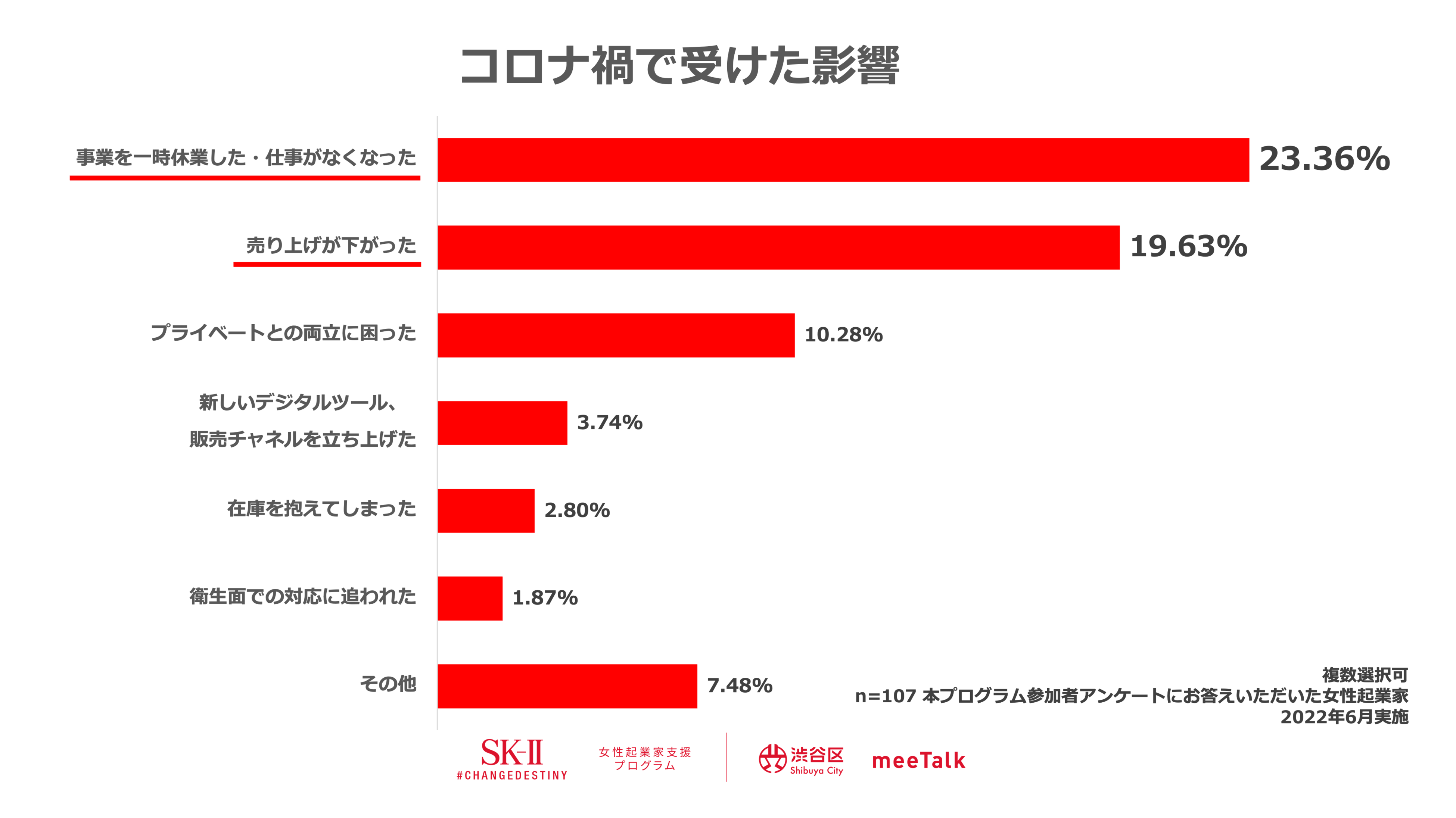 プログラムの事前アンケートに回答した107名の女性起業家へのアンケート調査の結果、コロナ禍で「一時休業や廃業」・「売上の低下」といった、財務面でビジネスに大きな影響を受けた起業家が40%を超えていることがわかりました。