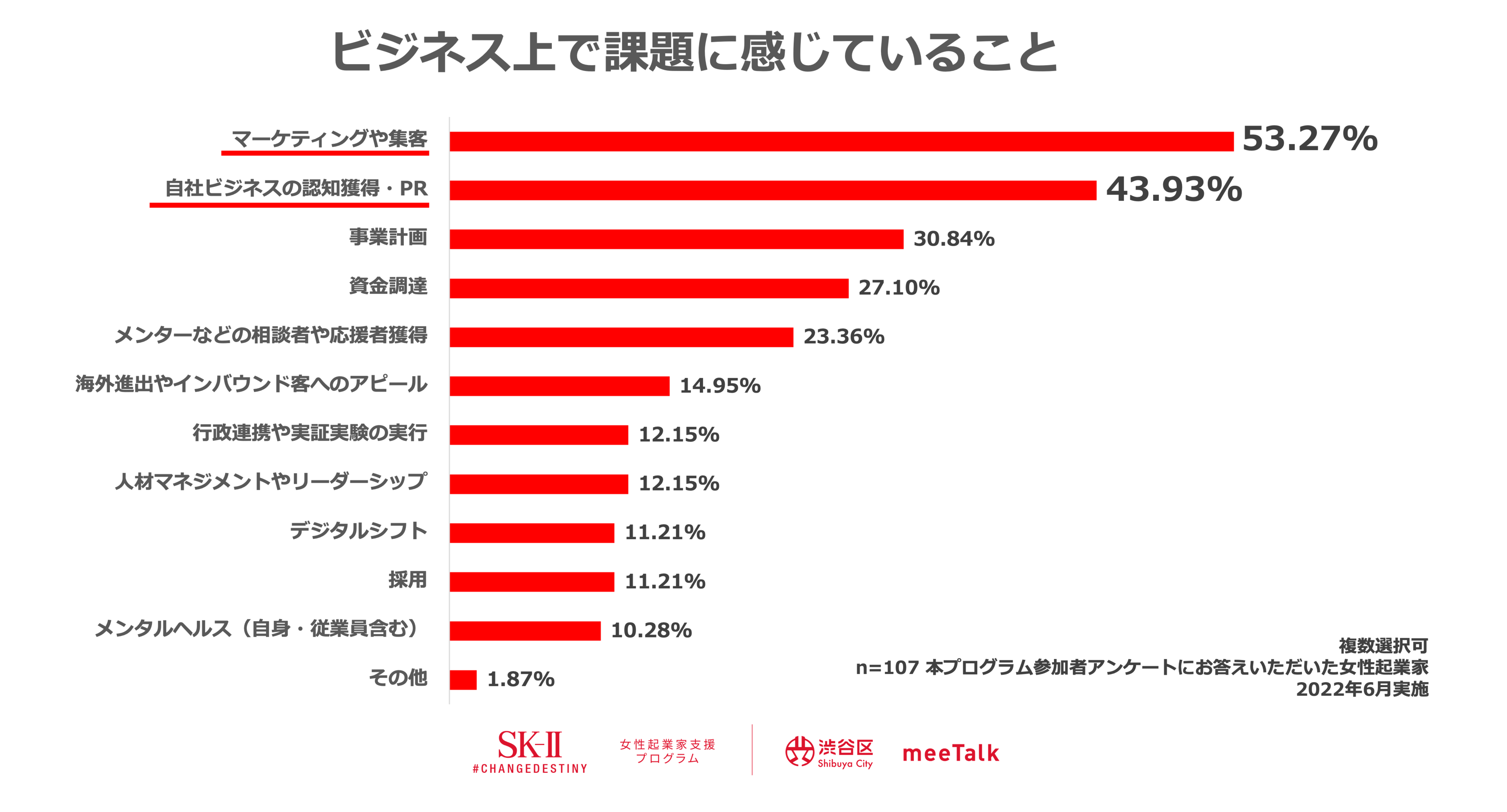 あたらしい社会に対応した事業展開を模索し、特別融資などを活用し既存事業や新事業に挑戦する女性起業家が多くいる中、事業を軌道に乗せ、拡大させるために、「マーケティング」や「PR」による集客に一番の課題を抱えていることがわかりました。