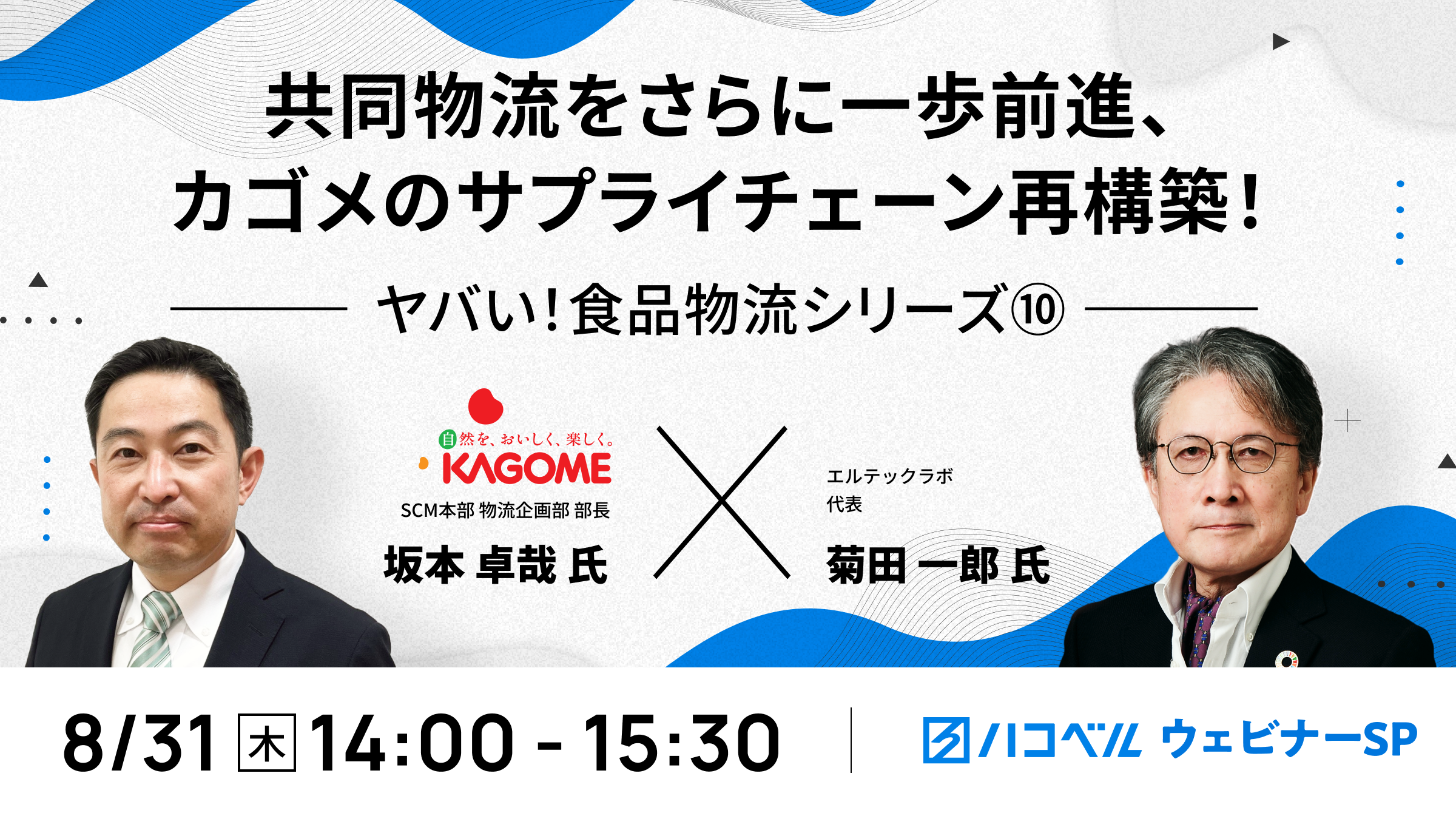 物流プラットフォーム「ハコベル」を展開するハコベル株式会社(本社:東京都中央区、代表取締役社長CEO:狭間 健志、以下:ハコベル)は8月31日(木)に、カゴメ株式会社 SCM本部 物流企画部 部長 坂本 卓哉氏、 L-Tech Lab 菊田 一郎氏の両名をお迎えし「共同物流をさらに一歩前進、カゴメのサプライチェーン再構築!」を開催することをお知らせいたします。