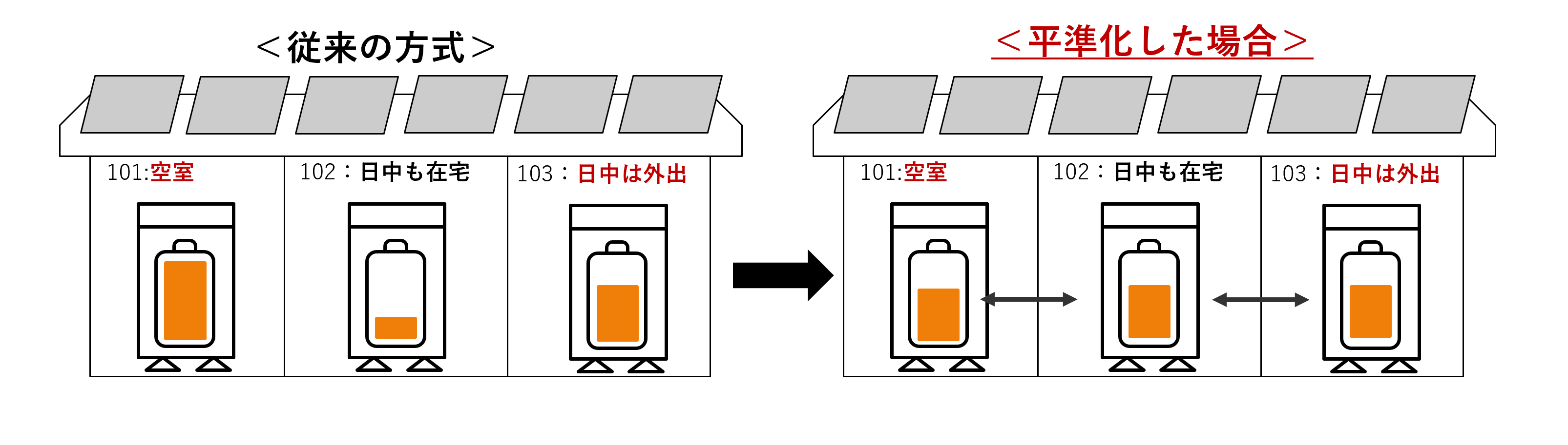 通常の蓄電システムでは、各住戸に接続されている設備の状況によって蓄電残量にばらつきが生じ、空室などの負荷が少ない蓄電システムに蓄えられた電力を他住戸分として活用することができません。しかし、本システムは複数の蓄電システムを平準化させることができるため、電力消費量の少ない蓄電池から、他の蓄電池へ電力を分配することが可能になります。それにより、電力会社からの買電量を少なくすることができます。