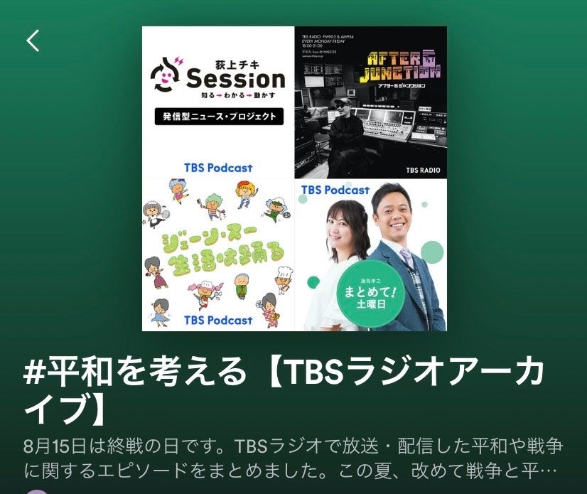 TBSラジオでは、明日8月15日「終戦の日」を前に、先の大戦を中心に「戦争と平和」に関する近年のPodcast配信をまとめたプレイリスト「#平和を考える【TBSラジオアーカイブ】」をSpotifyで公開しました。
