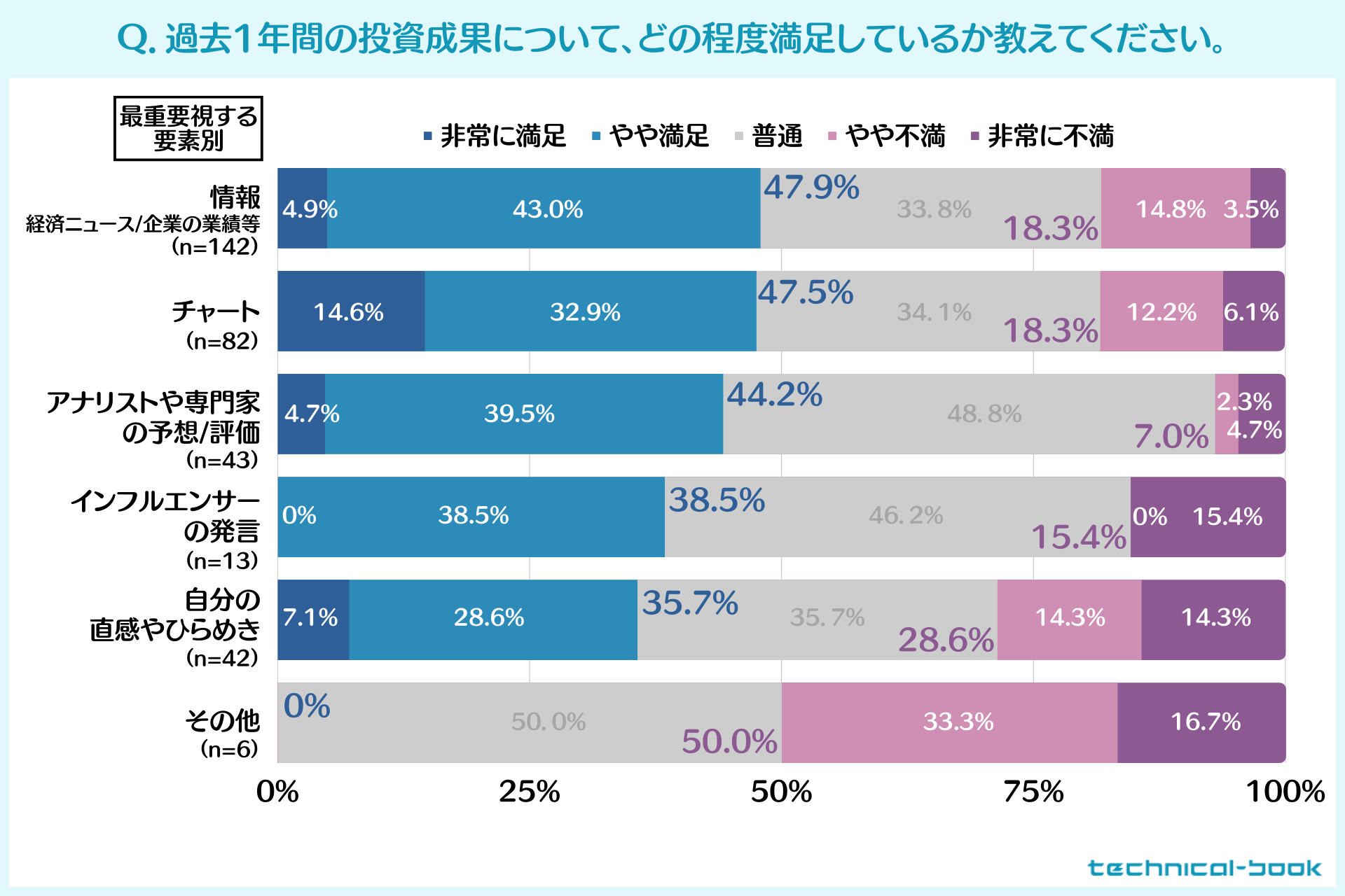 また、「チャート」を最重要視する人については、「非常に満足」と回答した人が14.6%と最も多いのが特徴です。テクニカル分析によって投資の満足度が上がりやすいことが読み取れます。