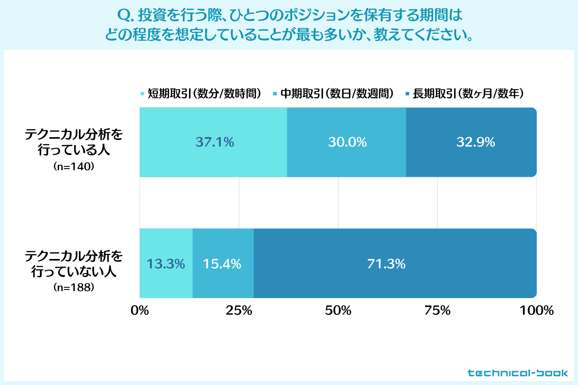 上のグラフは、投資における取引スパンについて、テクニカル分析を行っている人と行っていない人に分けて集計したものです。数分/数時間の短期取引、数日/数週間の中期取引、数ヶ月/数年の長期取引は、それぞれ以下のような割合になりました。