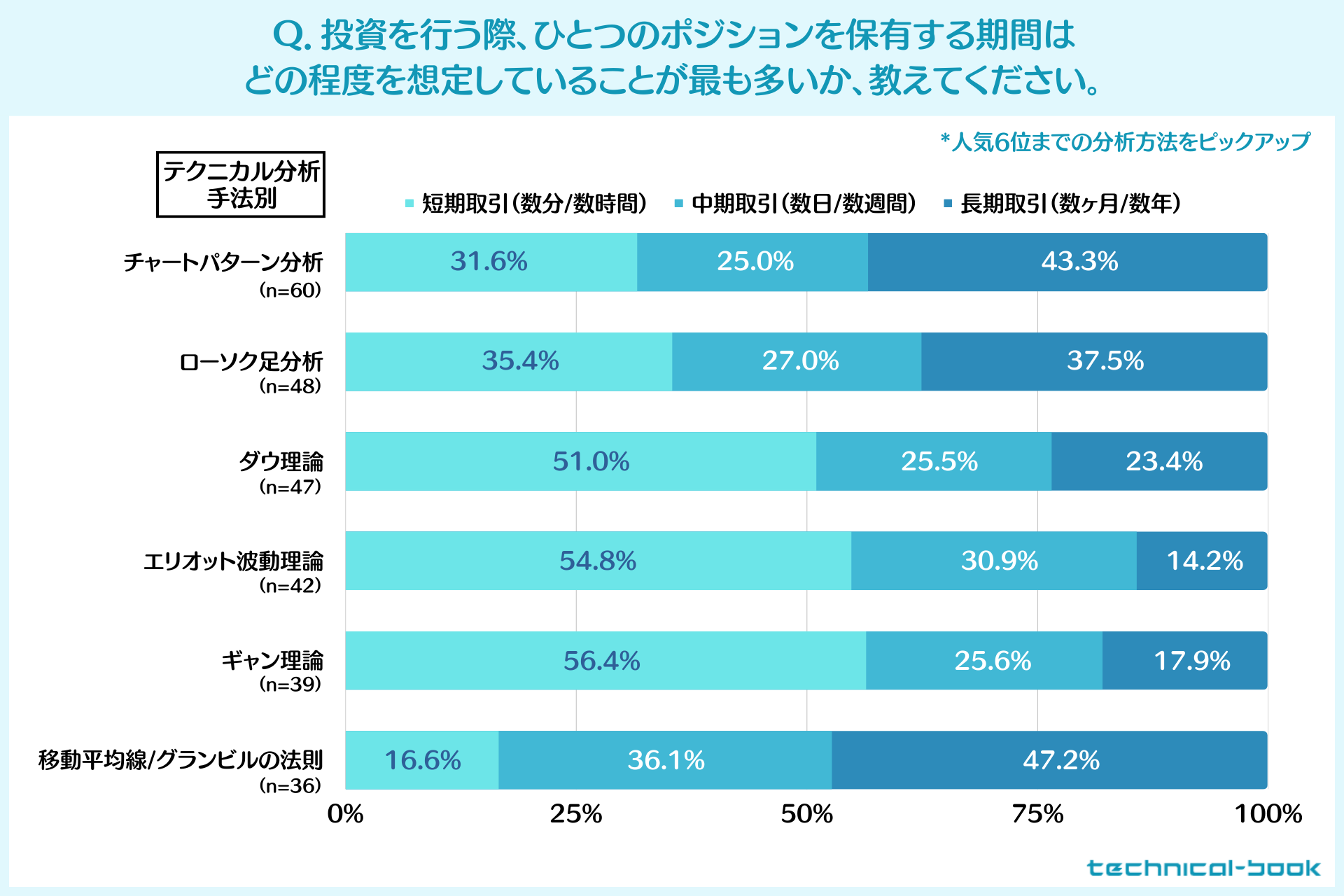 この中で短期取引が最も多い割合となったのは「ギャン理論」で56.4%、僅差で2位が「エリオット波動理論」の54.8%、3位が「ダウ理論」の51.0%となっています。逆に、短期取引が極端に少なかったのは「移動平均線(グランビルの法則を含む)」で16.6%という結果でした。