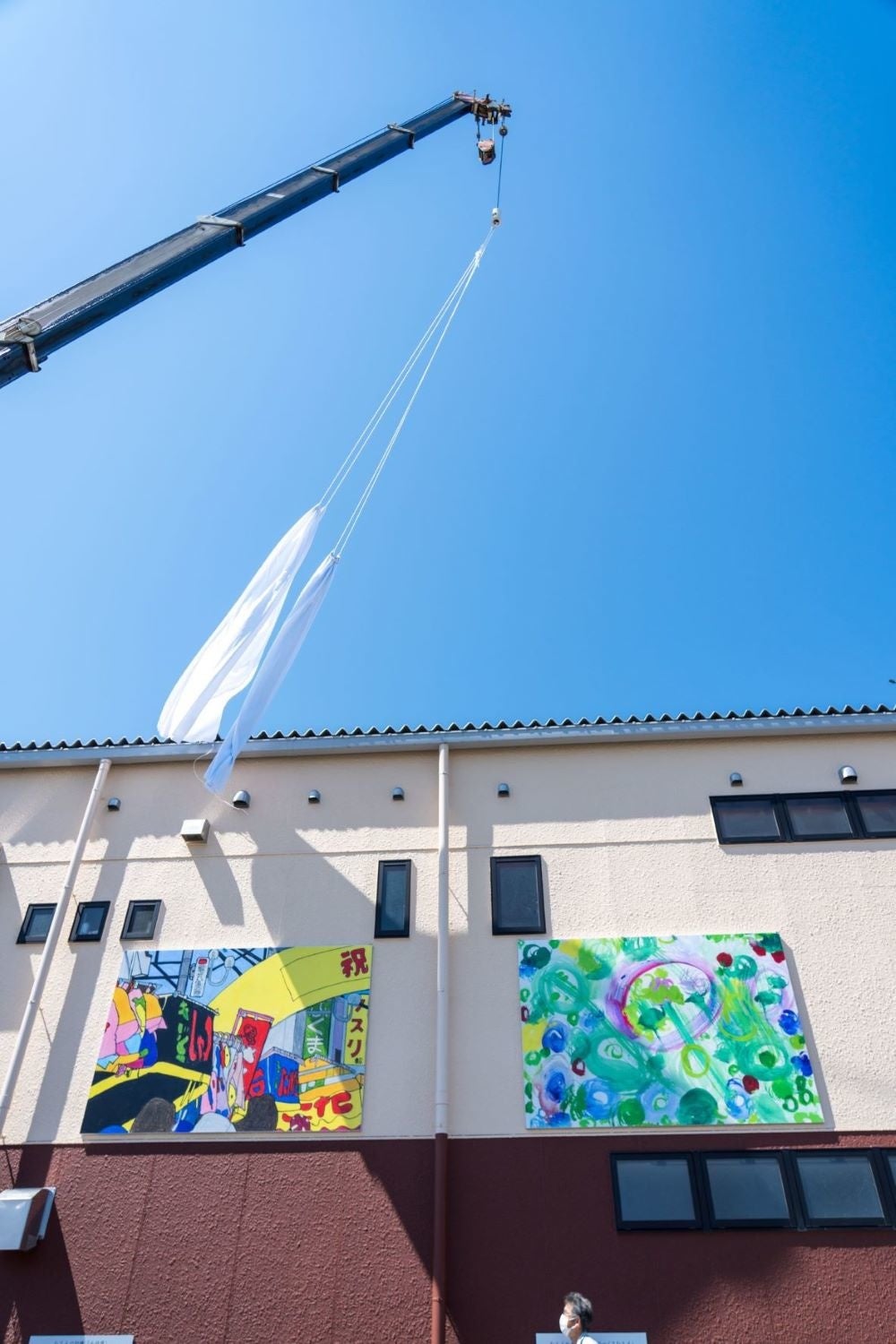 10日に開催されたお披露目式では、吉田浪江町長、ヘラルボニーの松田文登代表、協賛企業の方々、ヒアリングに参加した住民のみなさんなどが参加する中、協賛企業の株式会社伊達重機のクレーン車によりアートの除幕が行われ、住民が残したい浪江町の記憶と創りたい浪江町の未来が鮮やかな色合いで表現されたアートがお披露目されました。