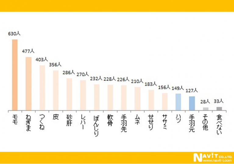 好きなネタを複数回答可で質問したところ、1人平均4つのネタを挙げています。「モモ」(630人)、「ねぎま」(477人)、「つくね」(403人)がトップスリーに座っていますが、14位の「手羽元」でも127人と回答者の12.7%を占めています。いろんなネタを楽しむ焼き鳥ファンの多いことがうかがえます。