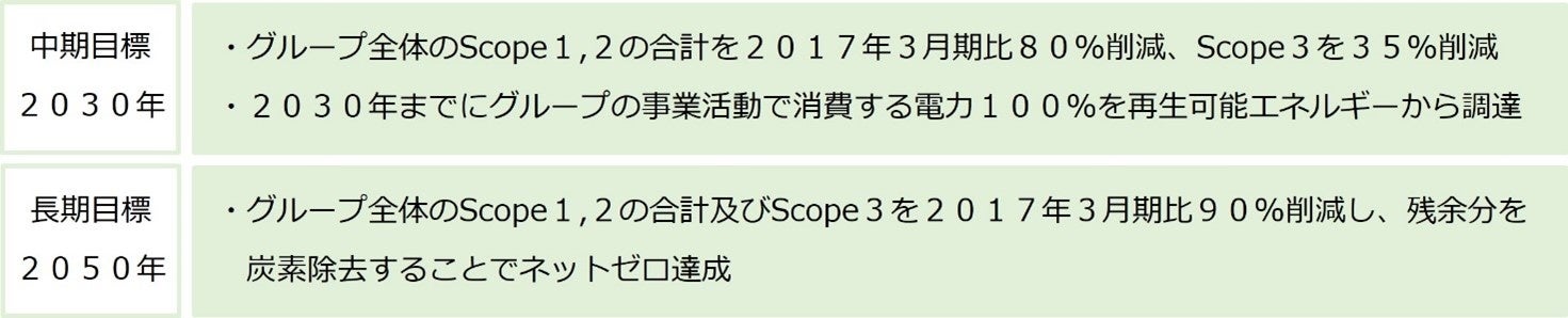 当社グループは2019年にSBT「1.5℃目標」に認定されており、2030年までに、2017年3月期比でグループ全体のScope1(※1)、Scope 2(※2)の合計を80%削減、Scope3(※3)については35%削減を目標として掲げておりました。
