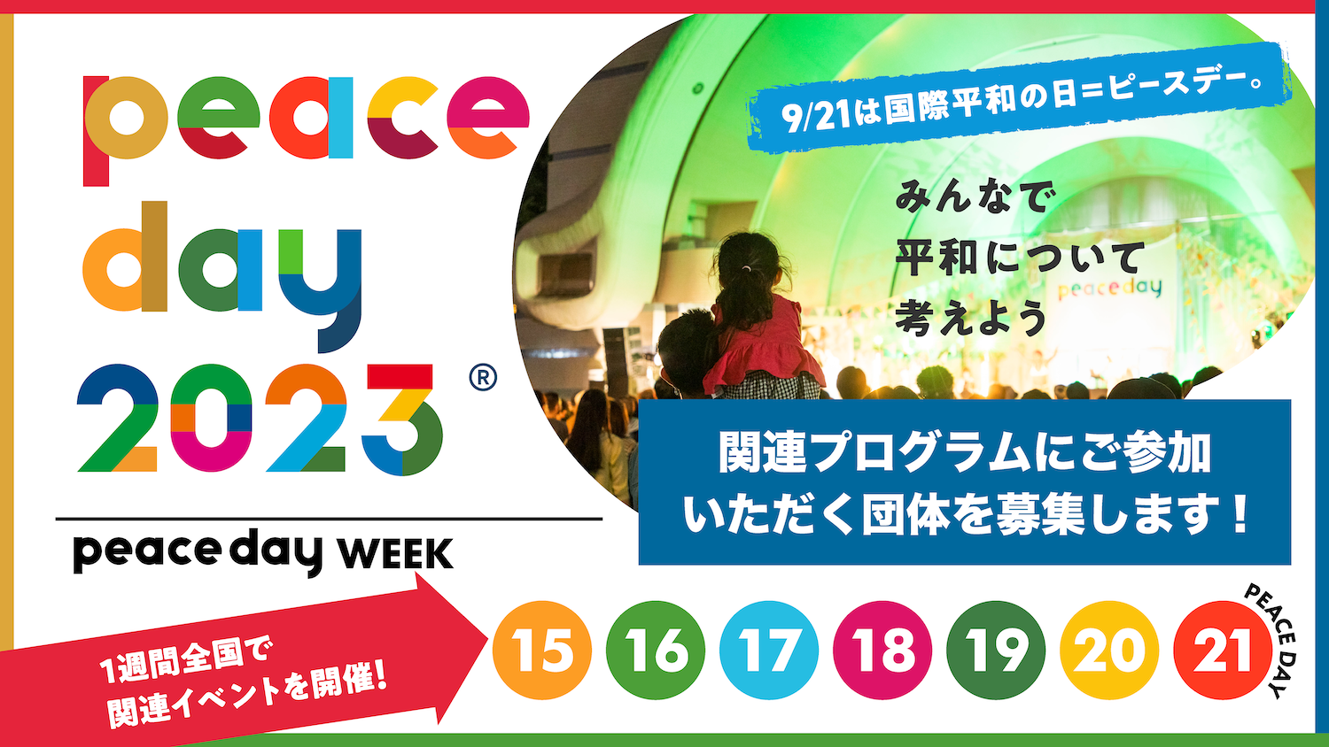 今年は9月21日「国際平和の日(ピースデー)」を含む、9月15日(金)~9月21日(木)までの1週間を「PEACE DAY 2023/PEACE DAY WEEK」として、さまざまなアクションを展開します。