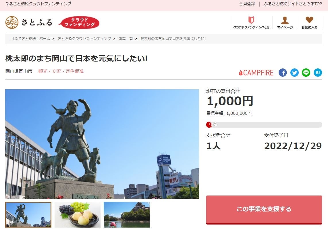 岡山市に来ていただき、桃太郎のまち岡山の魅力を体感してほしいという思いはあるものの、感染症の状況は日々変化します。そこで、いつでも参加できる「ふるさと納税」という方法で、「桃太郎のまち岡山」を応援してくださる方を募ります。