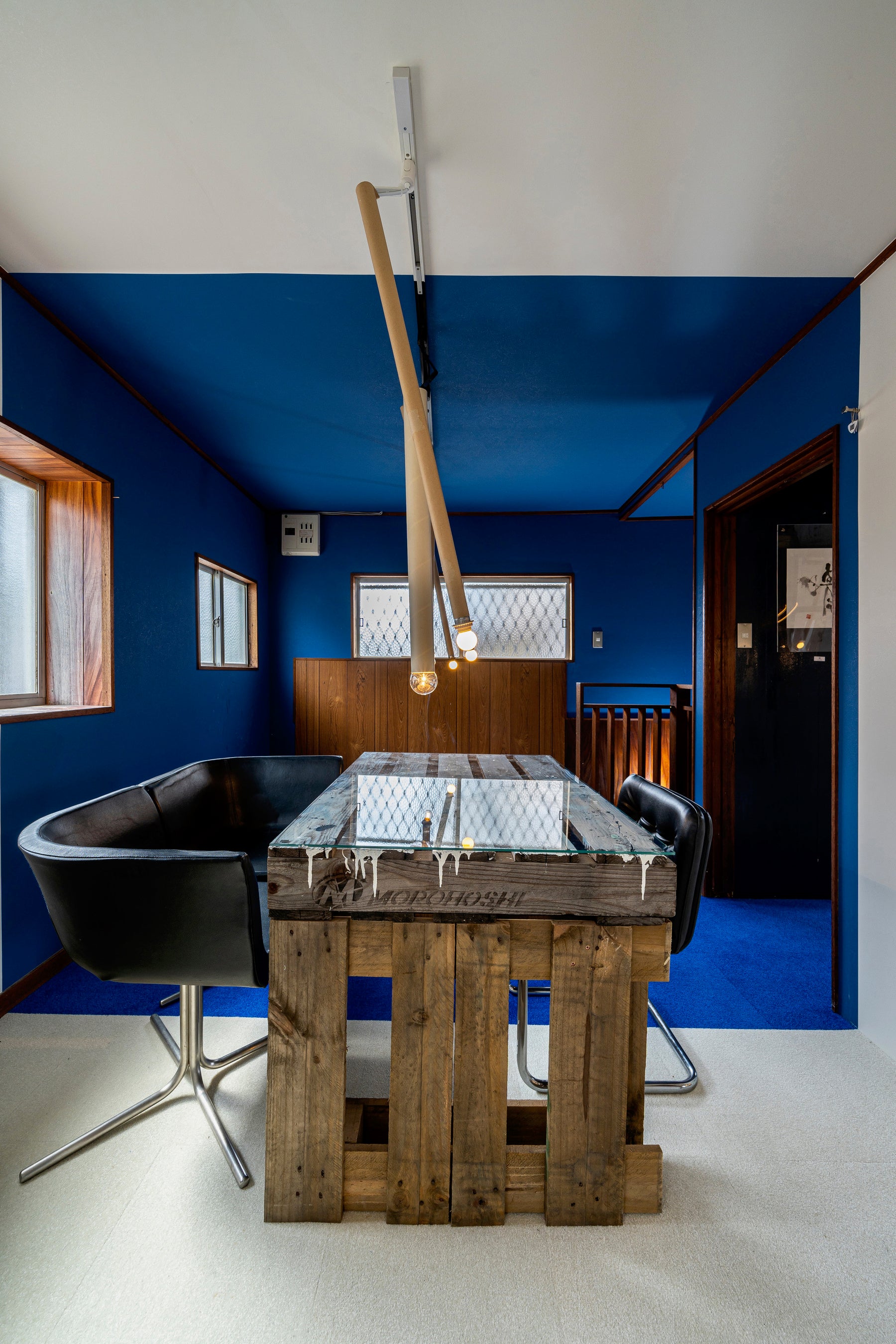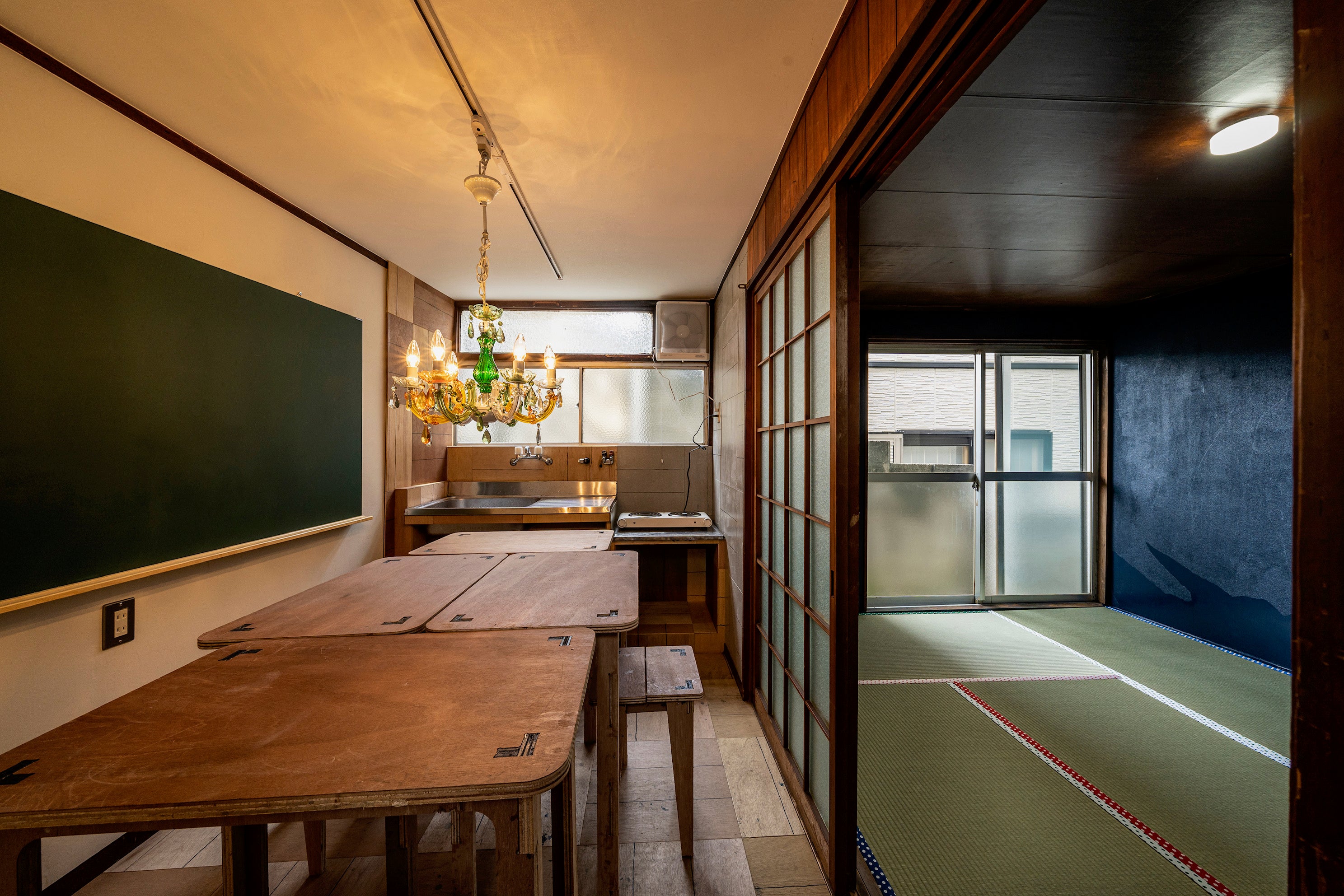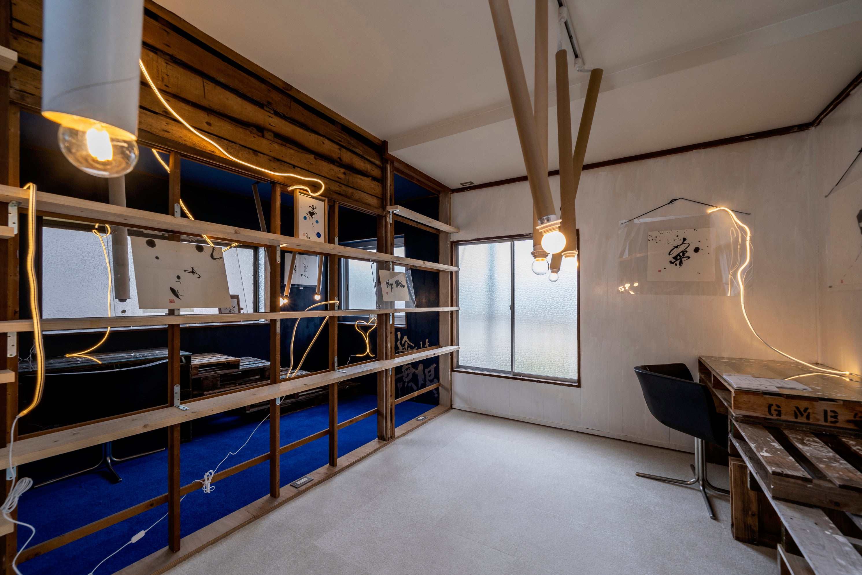 ここは明石と舞子の「境界」。だから私は一階では境界を建築で表現した。世の中には、人種・宗教・ジェンダー・領土など、様々な「境界」が存在する。そしてそれが、優越や利益を求めて差別や争いを引き起こしている。だから私は境界に釘を刺したり、ライティングで境界を曖昧にした。SDGsやサスティナブルを意識し、様々な廃材を使ったリノベーションにし、廃材と資材の境界も無くした。そして地下階は「学校」をテーマにした。学び直しの為の授業(セミナー)や遊び直しの為の給食(パーティー)が出来るように。そして和室はカラフルなヘリで「多様性」を表現した。多様な方々にくつろいで欲しいから。思うに、「境界」と「多様性」は少し似ている。多分、「違い」と共生するか、排除するか。