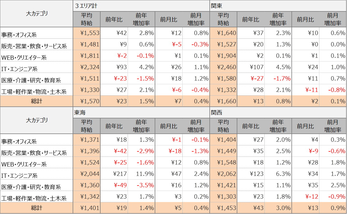 各エリアの平均時給について、関東エリアは1,660円(前年比13円増、前月比2円増)、東海エリアは1,401円(前年比19円増、前月比5円増)、関西エリアは1,453円(前年比43円増、前月比13円増)となりました。