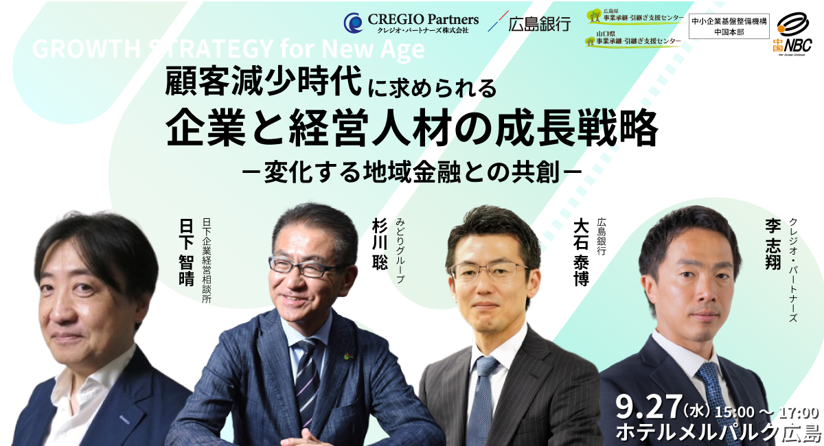 本イベントでは、このように変化する新しい時代において、地域企業はどのような成長戦略/人材戦略を持つべきか、また、変化し続ける地域金融機関とどのような関係性を築くべきかについて、実際に地域においてエクイティを活用し、成長・拡大を続ける企業経営者と、地域金融機関、M&A・事業承継・エクイティファイナンスの専門家が議論を行い、中国地域から成長企業を創出する可能性を探ります。