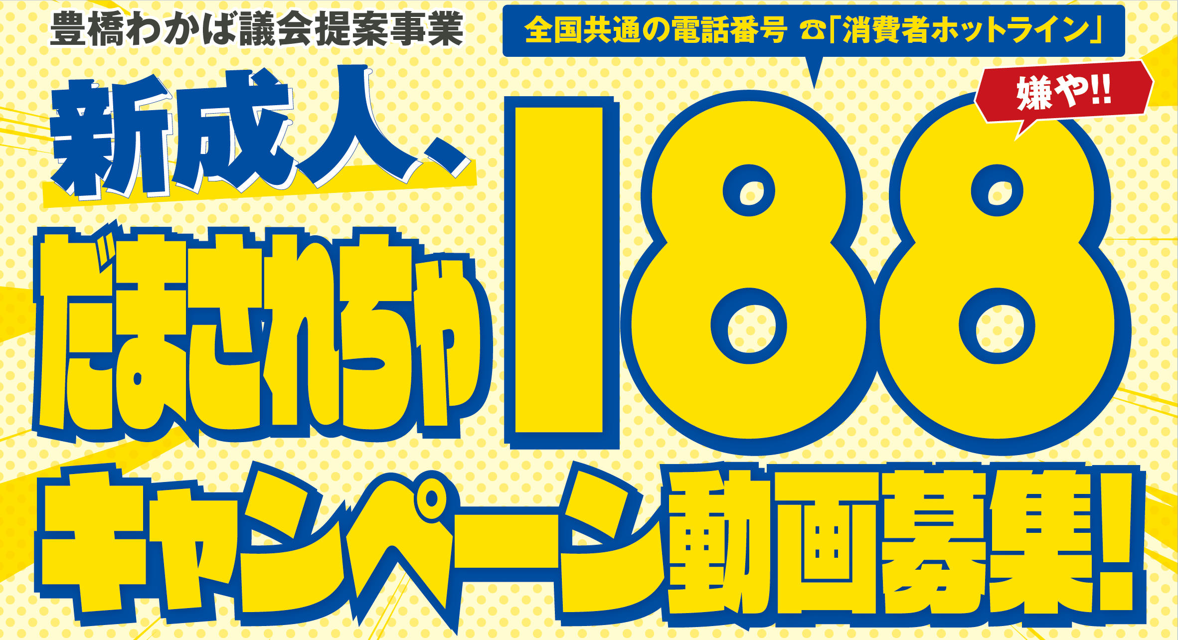 そこで豊橋市では 15~25歳の若者で構成された豊橋わかば議会の提案により若者に消費者ホットラインの電話番号「188」を知ってもらうため、「新成人、だまされちゃ188(嫌や!!)消費者トラブル未然防止啓発動画コンテスト」を開催。若者の心に響く、15秒以内の啓発ショート動画を募集します。