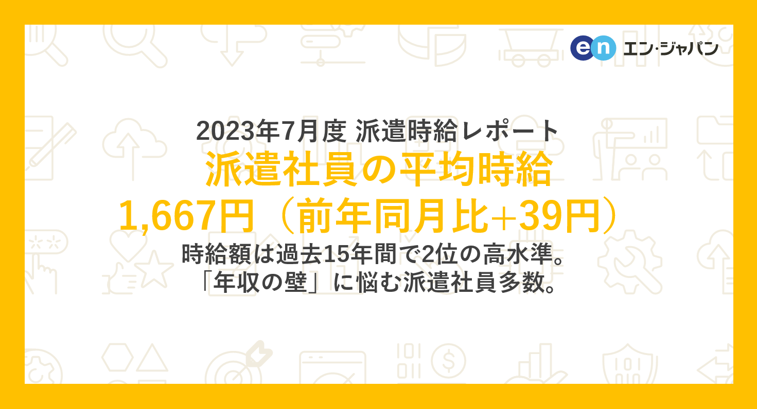 2023年7月度の三大都市圏平均時給は1,667円(前月比-4円・0.2%減、前年同月比+39円・2.4%増)。過去最高時給を記録した2023年6月度に次ぎ、過去2位の高水準となりました。平均時給の上昇には、社会保険の適用拡大が影響しています。