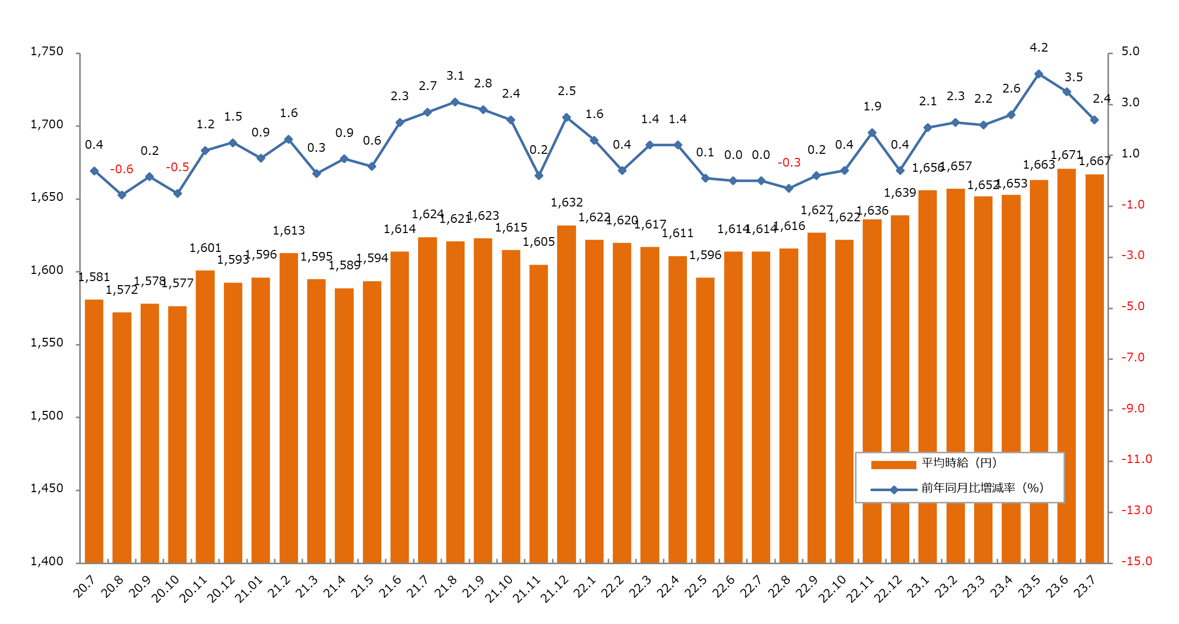 7月度の三大都市圏平均時給は1,667円。前年同月比+39円で最低時給を大きく上回る。