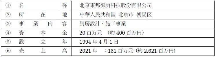 東邦御厨社は中国の北京市に拠点を置く業務用厨房設計・施工会社であり、高級ホテルや大手企業向け社員食堂内における厨房施工等を強みとし、市場からも高い評価を得ている会社です。東邦御厨社は近年、既存顧客に加え、スーパーマーケットやコンビニエンスストアへの事業を拡大しており、さらなる収益力向上が期待できます。