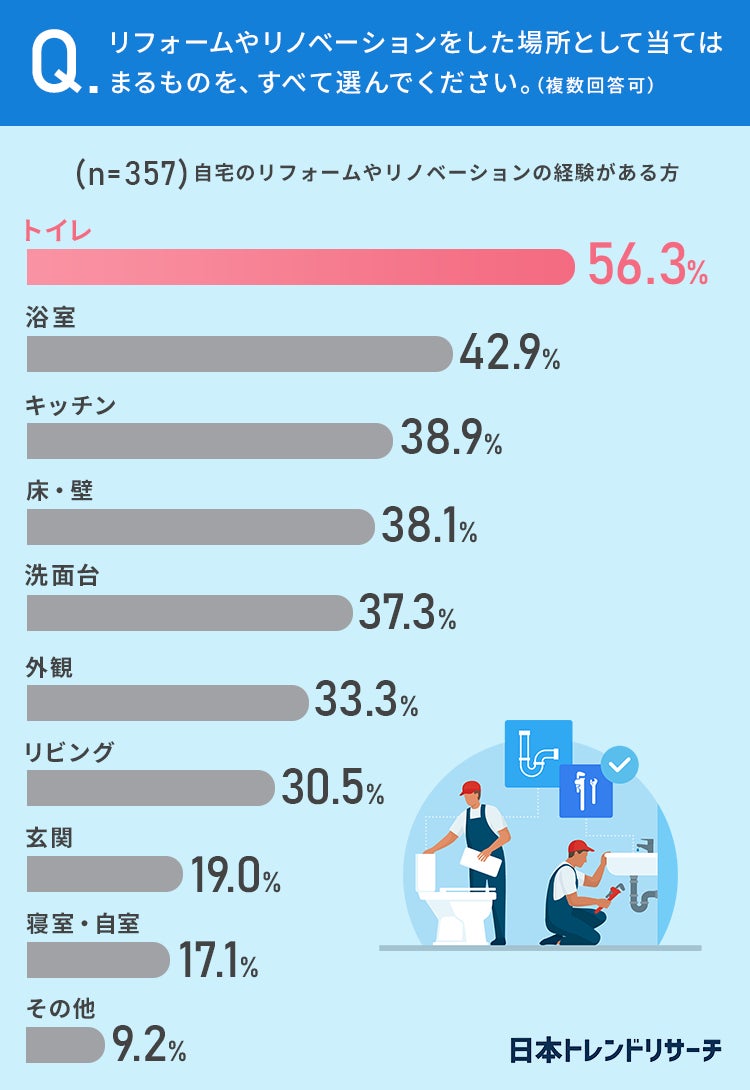 質問2:リフォームやリノベーションをした場所として当てはまるものを、すべて選んでください。(複数回答可)