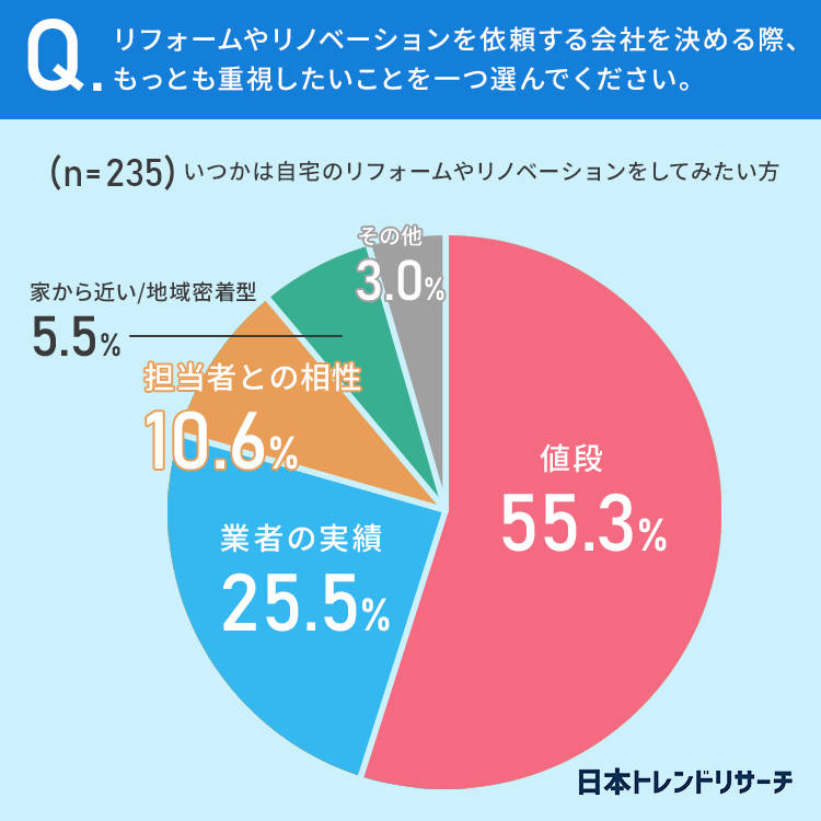 ちなみに「その他」には「自分の希望をどのくらい実現できるか」や「環境に優しい素材を使ったリフォームをしている業者さん」などが挙げられていました。