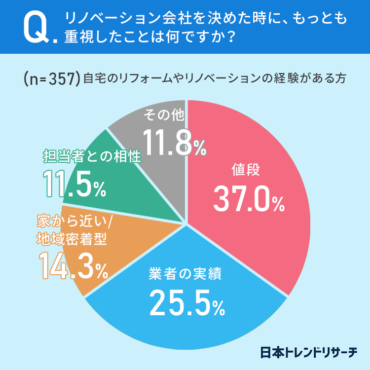 リノベーション会社を決めた時に、37%の方が「値段」をもっとも重視したと回答しており、その理由として単純なコスパの良さだけでなく、安すぎても不安になるといった声もありました。